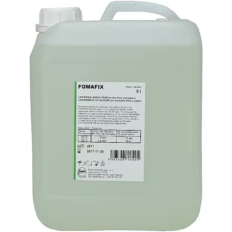 description_en - Foma Fomafix is a fast-acting, non-hardening fixer for use with every type of black and white film and paper. It can be used for manual processing (developing tank or tray) and for automated processing (machine processors). The fixer is highly efficient and features a strong buffer ability with long-term stability. Dilution for manual processing is 1:5, while dilution for machine processing is 1:4. 1 liter of working solution at dilution 1:5 will fix 17 35mm films (36 exposures) or roll films (120), a corresponding amount of sheet film (up to 40 sheets size 12.7 × 17.8 cm), or 3 m² of photographic paper. Fixing time at 20 °C is 1.5–3 min, depending on the type of film/paper. The contents of this package will make up to 30 liters of fixer.