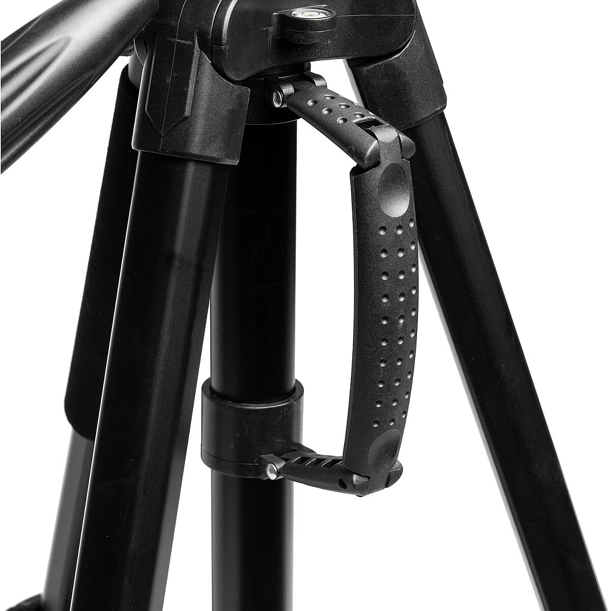 The 3-way head allows you to quickly and conveniently change the shooting angle, and the convenient control lever makes moving the tripod head particularly smooth. A built-in level ensures that the tripod is always perfectly balanced. In addition, the quick-mount plate allows the camera to be quickly and easily attached to the tripod. Portable design