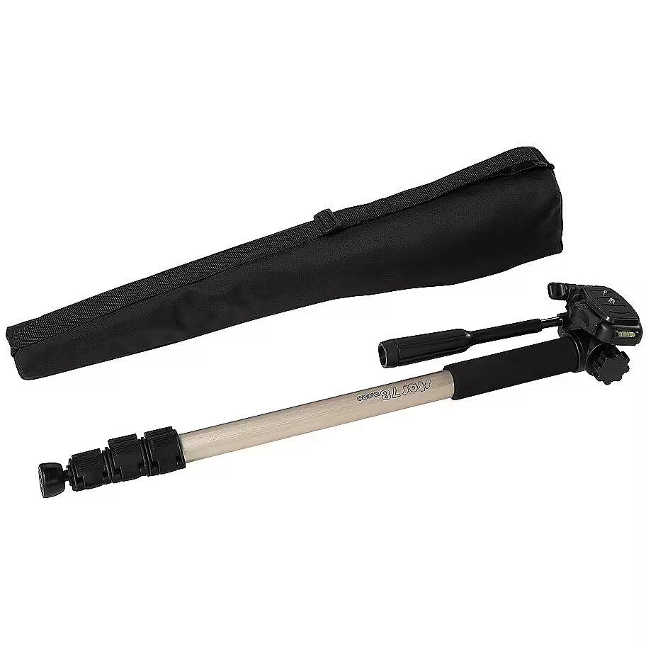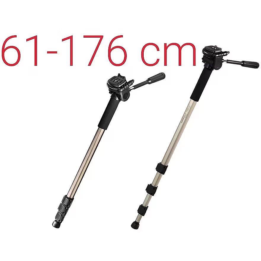 LongDesc - - 4-section, telescopic monopod for photo and video.- Ideal for mobile users, for rough ground and for all places where three legs do not have much space.- With 3D pan head and camera spirit level.- With A 1/4 threaded mount.- Ball-bearing base.- Tripod legs (round profile; ø 26.7 mm) individually adjustable.- Height min.: 61 cm.- Height max.: 176 cm.- Weight: 665 g.- Incl. bag.