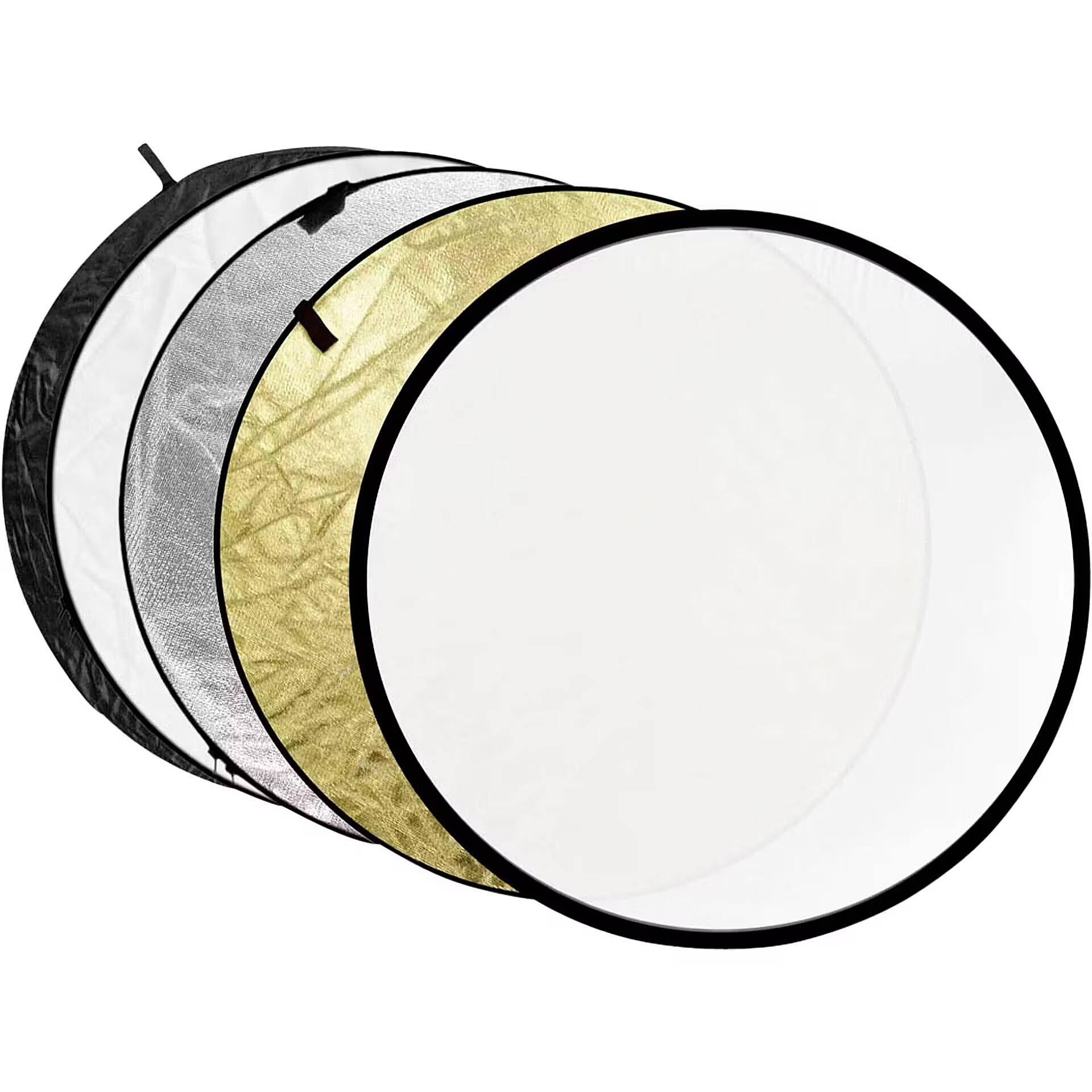 description_en - The 5in1 reflector is a standard diffuse reflector supplied with a removable cover. This is equipped with 5 different colours: white, gold, silver, black and transparent. The reflector has a diameter of 60 cm and can be folded and packed away in the supplied carry bag. 5in1 reflector with a carry bag White, silver, gold, black & transparent sides Can be also used as a light diffuser Practical foldable design Diameter: 60 cm