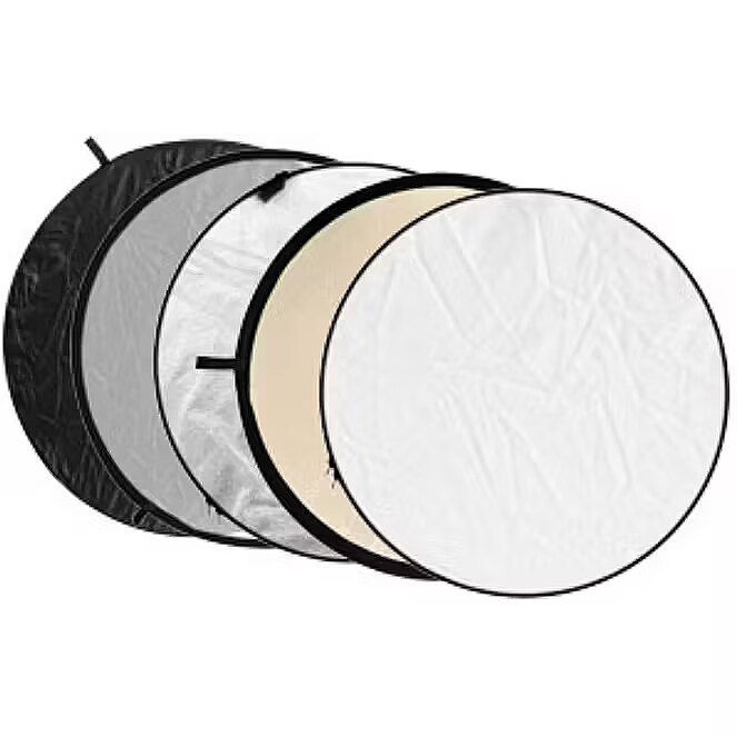 description_en - The 5in1 reflector is a standard diffuse reflector supplied with a removable cover. This is equipped with 5 different colours: white, soft gold, silver, black and transparent. The reflector has a diameter of 80 cm and can be folded and packed away in the supplied carry bag. 5in1 reflector with a carry bag White, silver, soft gold, black & transparent sides Can be also used as a light diffuser Practical foldable design Diameter: 80 cm