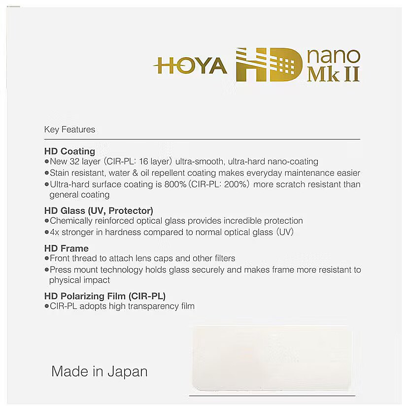 description_short_en - High quality circular polarizer filter Hoya HD Nano Mk II series New smooth & hard nano coating Slim matte black aluminium frame For lenses with 62 mm filter thread