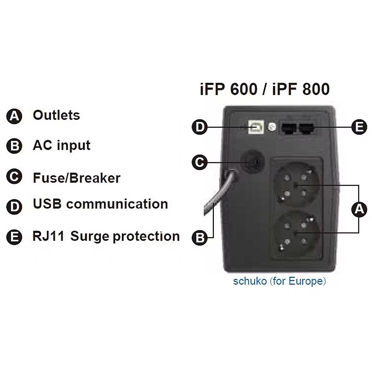 LongSummaryDescription - FSP iFP 800. UPS topology: Line-Interactive, Output power capacity: 0.8 kVA, Output power: 480 W. AC outlet types: Type F, AC outlets quantity: 2 AC outlet(s), USB port type: USB Type-B. Battery capacity: 9 Ah, Battery voltage: 12 V, Battery recharge time (90%): 4 h. Form factor: Mini Tower, Product colour: Black, Control type: Buttons. Compliance certificates: CE, cTUVus