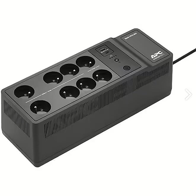 Description - Output power capacity: 520 Watts / 850VA Output Connections: (6) French/Belgian (Battery Backup), (2) French/Belgian (Surge Protection) APC Back-UPS 850VA, 230V, USB Type-C and A charging ports Battery Backup & Surge Protector for Electronics and Computers Adjustable voltage sensitivity Provides the ability to adapt the UPS for optimal performance in specific power environments or generator applications. Audible alarms Provides notification of changing utility power and UPS power conditions Automatic self-test Periodic battery self-test ensures early detection of a battery that needs to be replaced. Battery charging indicator Lets you know when your battery is charging and when it is fully charged. Battery failure notification Provides early-warning fault analysis on batteries enabling timely preventive maintenance Building Wiring Fault Indicator This LED informs users of potentially dangerous wiring problems in the wall circuit. Cold-start capable Provides temporary battery power when the utility power is out. Dataline surge protection Provides protection of connected equipment from power surges on the data lines. Disconnected battery notification Warns when a battery is not available to provide backup power. Hot-swappable batteries Ensures clean, uninterrupted power to protected equipment while batteries are being replaced Safety-agency approved The UPS is UL1778 Listed Simple battery replacement Increases UPS availability by allowing quick, easy battery replacement. USB charging ports Allows you to simultaneously charge and power your mobile phone and handheld computer using APC USB charging cables (sold separately). USB connection Use your PC to access additional power protection and management features for your UPS via a USB Port. User-replaceable batteries Increases availability by allowing a trained user to perform upgrades and replacements of the batteries reducing Mean Time to Repair (MTTR)