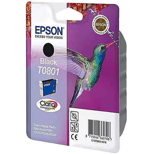 LongSummaryDescription - Epson Hummingbird Singlepack Black T0801 Claria Photographic Ink. Black ink type: Pigment-based ink, Colour ink volume: 7.4 ml, Printing colours: Black, Quantity per pack: 1 pc(s)