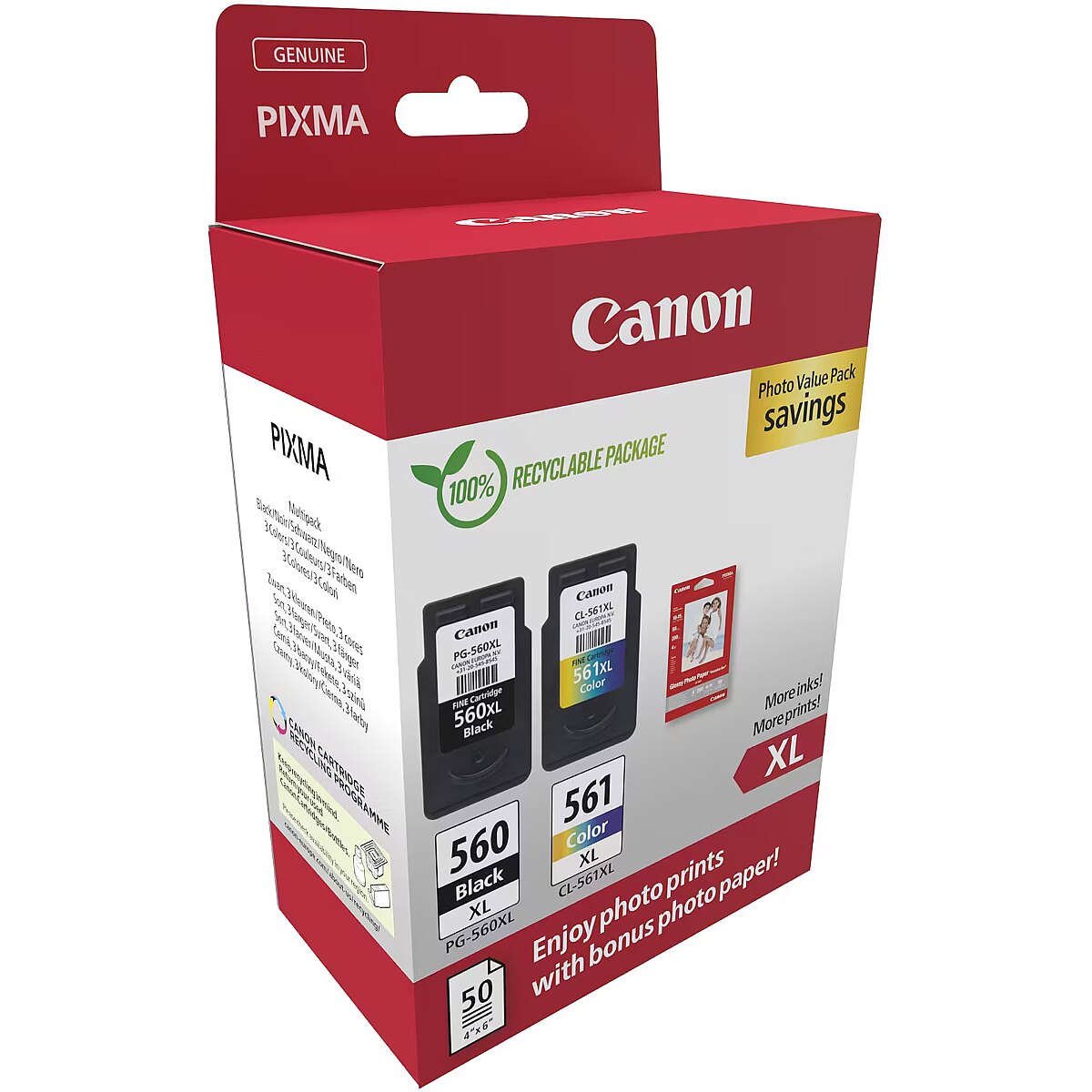 Description - Savings Package: Canon PG-560XL Black Ink Cartridge, CL-561XL Color Ink Cartridge and Photo Paper The package includes 1 12.2 ml black FINE cartridge, 1 14.3 ml cyan, magenta and yellow FINE cartridge and a photo paper pack for printing documents and photos in vivid colors. The black ink cartridge can print up to 400 pages of A4 documents, and the color ink cartridge can print up to 300 A4 pages, each with the high quality and reliability of genuine Canon ink. Documents from clear and sharp text, professional results The black ink cartridge allows you to print up to 400 pages of A4 documents The color ink cartridge allows you to print up to 300 pages of A4 documents Rely on the consistent quality and reliability of Genuine Canon ink The included package of Canon photo paper saves you money Used toner or ink cartridges can be returned for reuse or recycling. The service is free, simple and ecological