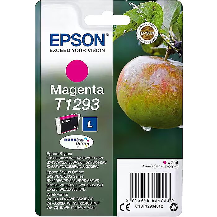 LongSummaryDescription - Epson Apple Singlepack Magenta T1293 DURABrite Ultra Ink. Colour ink type: Pigment-based ink, Colour ink page yield: 378 pages, Colour ink volume: 7 ml, Printing colours: Magenta, Quantity per pack: 1 pc(s)