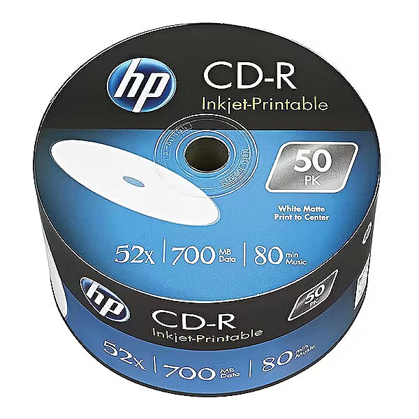 Description - HP CD-R discs in a 50-pack spindle are reliable media for storing data, music, and multimedia files. Each disc offers a capacity of 700 MB or 80 minutes of recording time, and a maximum write speed of 52x. This product is designed for write-once use and cannot be printed on. It is an ideal choice for data archiving.