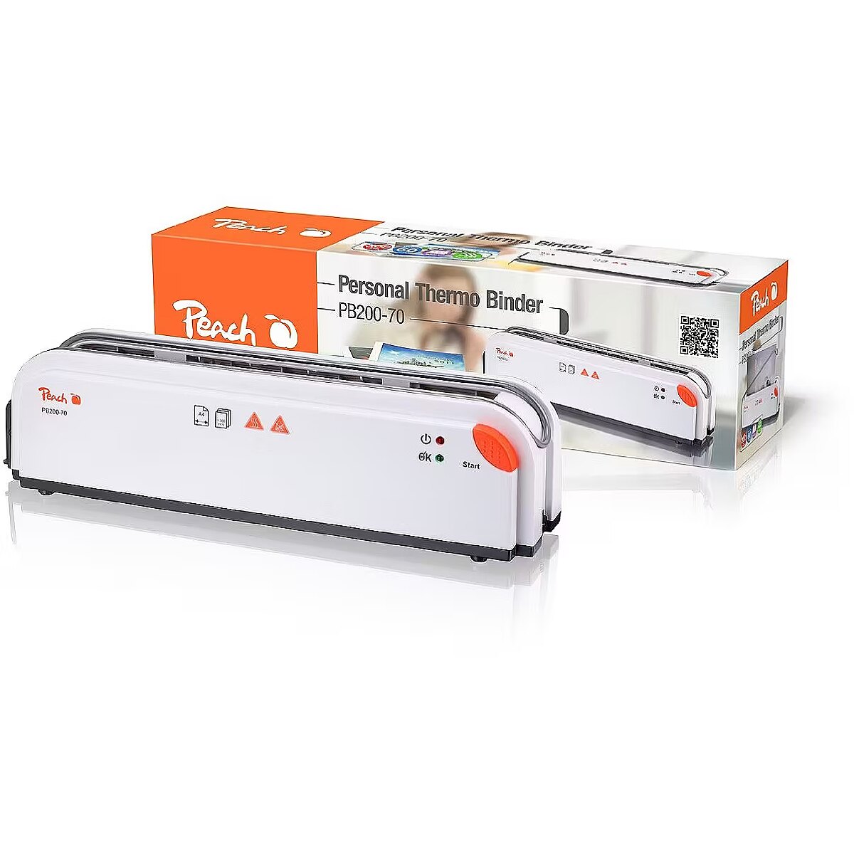 LongDesc - Peach A4 Thermal Binder - PB200-70The thermal binding system from Peach is a modern adhesive-bonding process. The adhesive in the binding cover's spine is heated within the unit until it assumes fluid form and bonds to the pages. Peach Thermal Binder Systems endow your documents with a professional appearance while simultaneously offering fast and easy operation: No need to punch holes in the pages, and it is also possible to bind several covers at the same time.