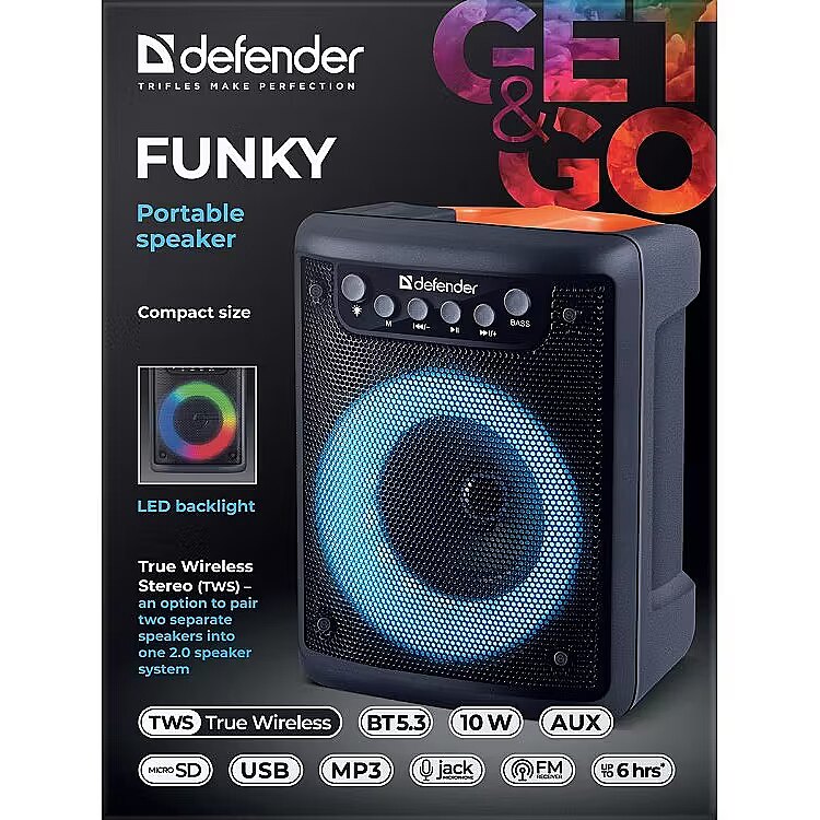 Description - Defender Funky Bluetooth Speaker 10W BT5.3 AUX FM MP3 USB microSD. Portable Speaker Portable speaker with Bluetooth support. Built-in MP3 player and FM radio. Supports USB flash drive and microSD cards.