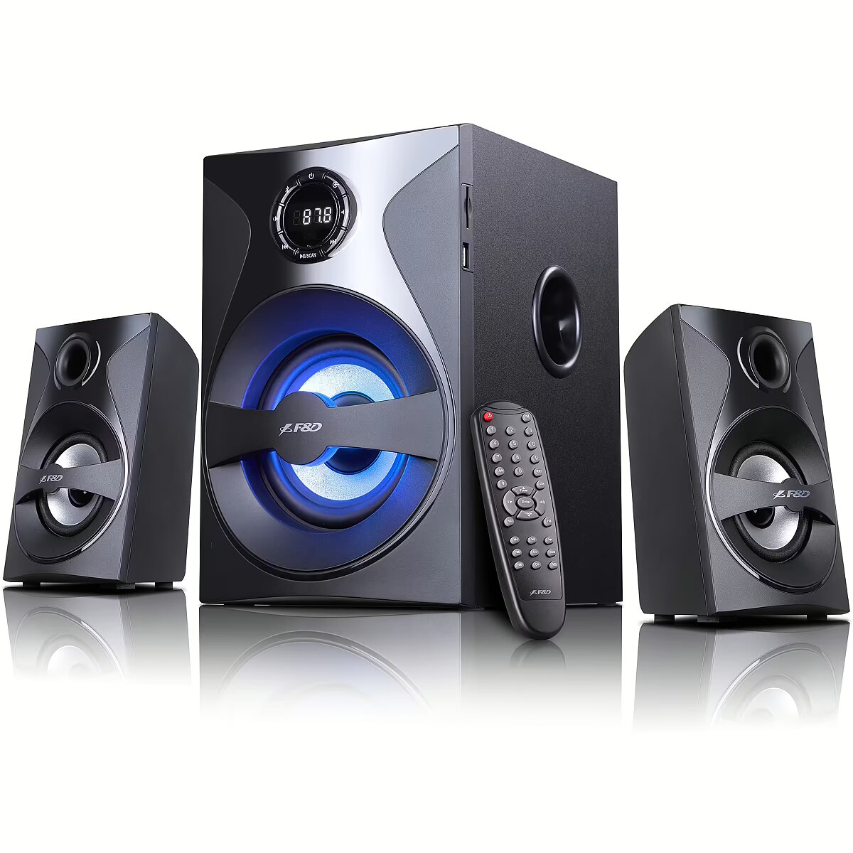 The number of speakers in the acoustic system determines the volume of sound of the system you have selected. If you want to just listen to music and watch films or want to place speakers on the computer table you should choose 2.0 Stereo or 2.1 (stereo+subwoofer) speakers. If you want to enjoy the Dolby digital spatial sound when you are watching DVD films or playing EAX games you should buy the system of speakers 5.1 or above.