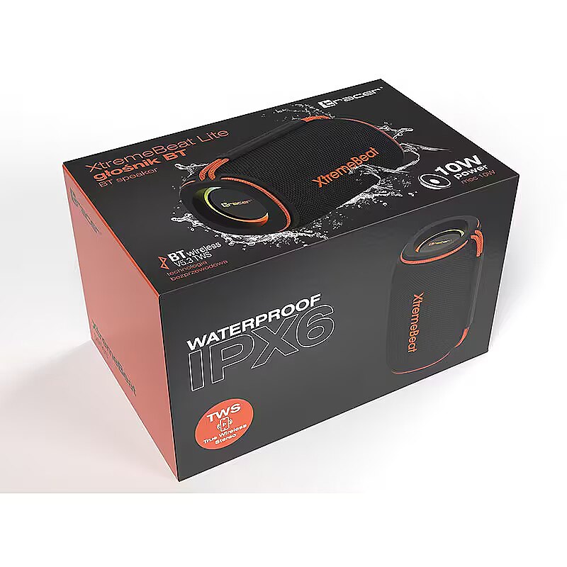 Description - TRACER XtremeBeat Lite TWS Bluetooth RGB Black Enjoy powerful sound and modern design! The TRACER XtremeBeat Lite wireless speaker is the perfect choice for music lovers who value mobility and style. Whether you're listening to music at home, at a party, or outdoors, this speaker delivers excellent sound quality and impressive RGB lighting that will enhance any moment. Power: 10W Wireless Technology: Bluetooth 5.3 Water Resistance: IPX6 Inputs: AUX, MicroSD, USB-A Flash Drive Fast Charging Port: USB-C RGB Lighting Battery Capacity: 1500 mAh Playback Time: Up to 6 hours 10W Power