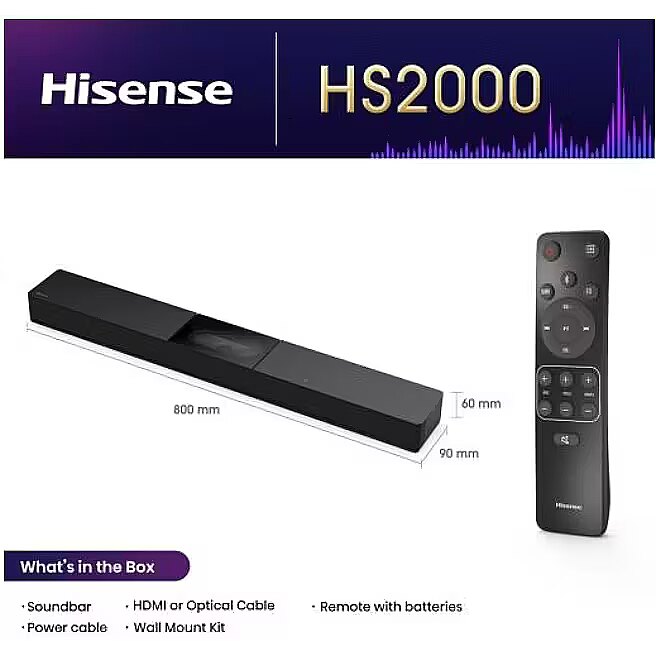LongDesc - One bar does it all for youElevate your sensory experience with this all-in-one 2.1 channel soundbar featuring visualised built-in subwoofer, bringing movies, music, and games to life. All in a design that blends seamlessly into your home.See the vibrationEnjoy deep bass sound from a visualised built-in subwoofer with minimal equipment cluttering up your living space.Feel sound from every directionFeel the combined force of Dolby Digital Plus 7.1 and DTS Virtual:X technology creating a virtualised floor-to-ceiling surround sound experience that makes you feel you are really there.Together is betterWith TV mode technology, when paired with Hisense TV you could enjoy the full potential of your TV's sound engine through the Soundbar speakers for immersive audio enhancements.One remote, double enjoymentEasily control your Hisense Soundbar’s sound modes through your Hisense TV remote to optimise audio and dialogue. Make the Soundbar setting menu appear on the TV, and control your Soundbar with the TV remote.Connect, Listen, EnjoyPlug and play.Bluetooth5.3, HDMI ARC, Optical and AUX can be selected to connect.Made for each otherWith this matching and low-profile design, the HS2000 Soundbar pairs perfectly with Hisense TVs.