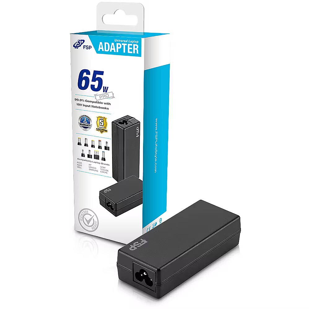LongDesc - Highly Efficient Power OutputThe NB PRO series is a notebook adapter that boasts over 88% high efficiency, delivering powerful output to your devices, while minimizing its environmental impact.100-240V Worldwide AC InputThe NB PRO series adapter accepts 100-240V AC input, making it compatible for use anywhere in the world.Compliant with IEC/EN 62368FSP features the latest in green power technology, and provides a full array of additional safety approvals to keep designs ahead of the changing regulations. FSP has upgraded the majority of our power supplies to comply with the new IEC/EN 62368 standard for your gaming rigs.Multiple Safety ProtectionFSP makes the best effort to do product safety. The NB PRO series adapter is designed with multiple circuit protection to keep you and your laptop in safe.9 Changeable Tips Fit with Most LaptopsThe tips included are compatible with most 18-20V input notebooks, such as IBM, Dell, Acer, Compaq, Sony, Toshiba, HP, Asus, Lenovo, etc.