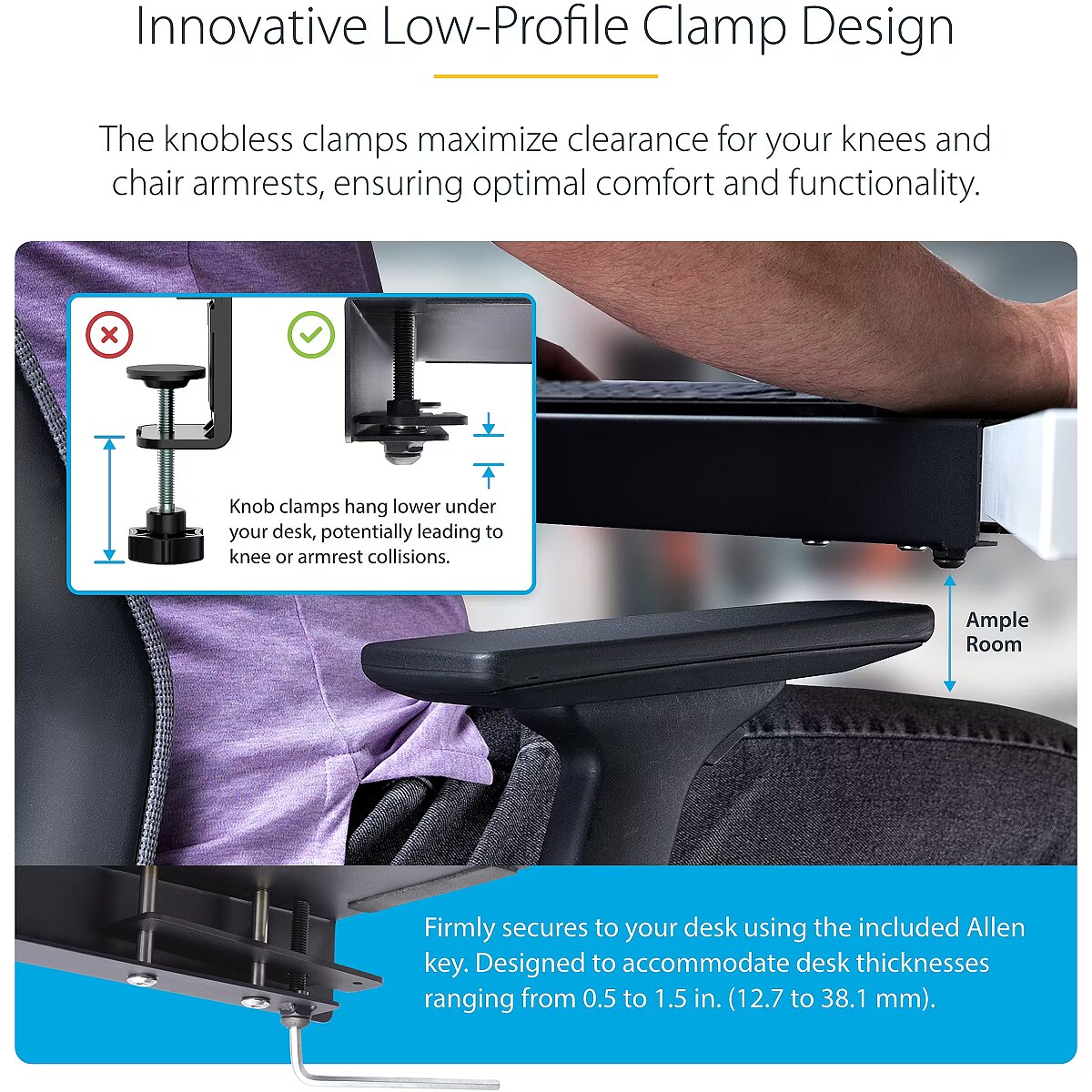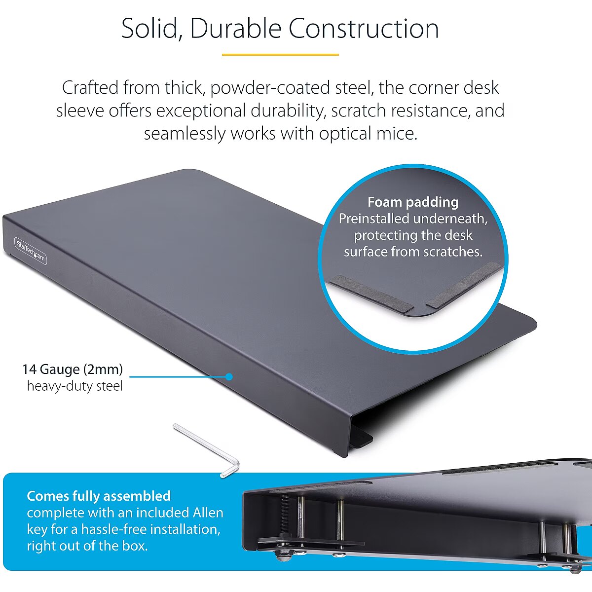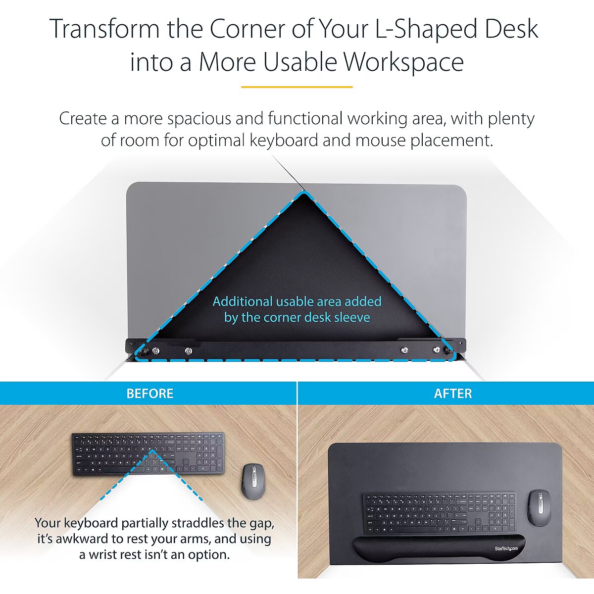 LongDesc - Expand your workspace with the desk corner sleeve for L-shaped desk while enhancing ergonomicsThis Desk Corner Sleeve clamps into the corner of a 90° L-Shaped or Corner desk to increase ergonomics and workspace. The Desk Corner Sleeve ships fully assembled, enabling rapid deployment in the office or at home.Maximize Desk Space and ComfortAdd 25x13.1in (635x332 mm) to the corner of an L-shaped desk creating enough area for a keyboard and a mouse. The Desk Corner Sleeve is compatible with desks 0.5 to 1.5in (127 to 381mm) thick. The desk extender enhances the ergonomics of corner desks by supporting the wrists while typing.Achieve the ideal distance from a monitor by setting it up on the corner of the desk for improved ergonomics and reducing eye strain.Innovative ClampThe Desk Corner Sleeve's low-profile design eliminates common issues associated with conventional knob-style alternatives, such as accidental knee impacts or potential damage to a chair's armrest. The clamp provides two installation options: attach it directly to the desk or fasten it to a wooden desk using the included wood screws.The protective foam strips on the desk extender protect the desk surface.Note: The provided screws are for 0.8in (20mm) or thicker wooden desks only. If using a thinner desk, the screws may damage the desk's top surface.Durable & SturdyBuilt to last, the Desk Corner Sleeve features a robust steel sheet construction to ensure its longevity and to keep it firmly in place.The StarTech.com Advantage