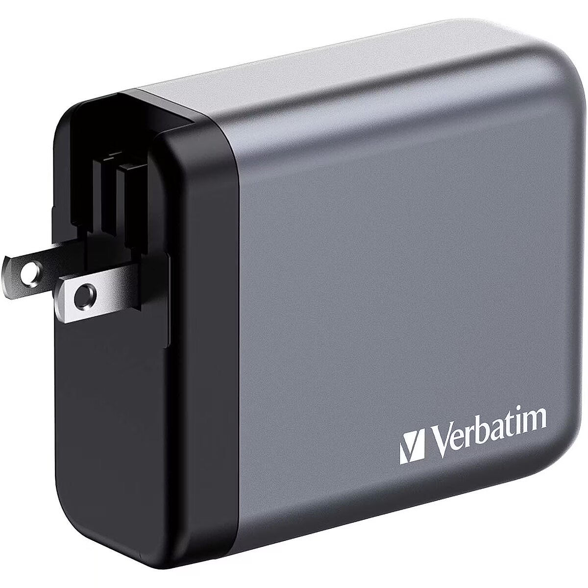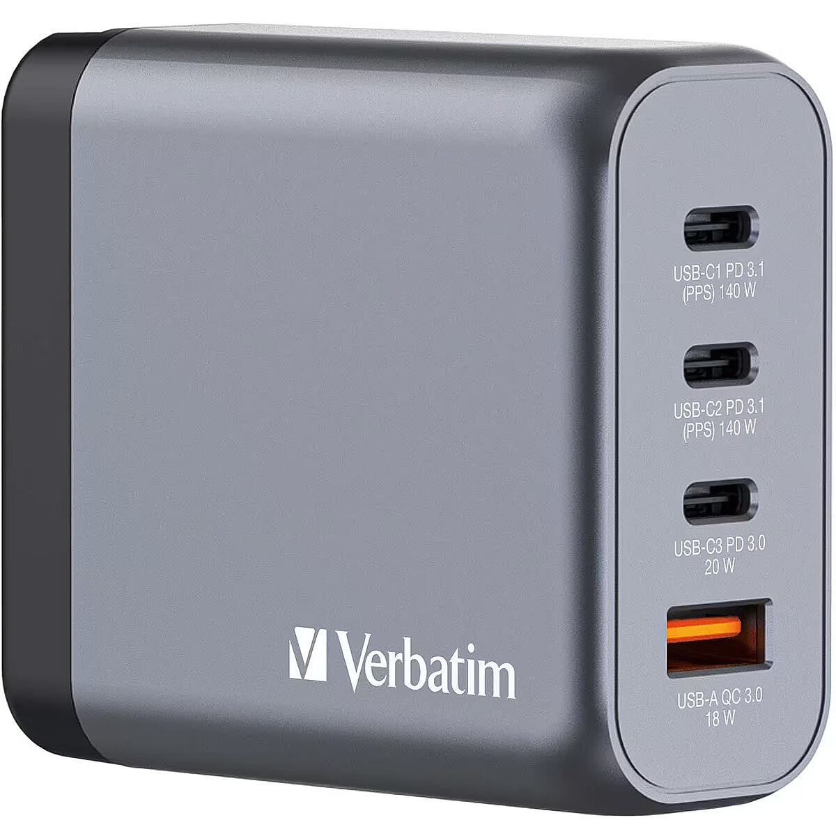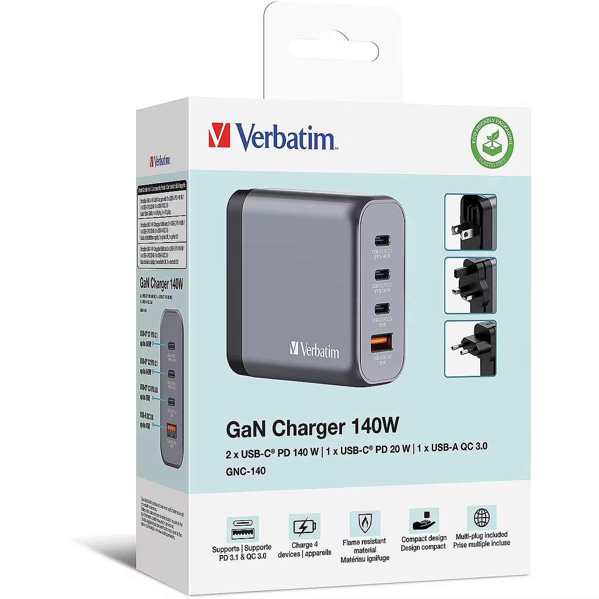 LongDesc - 140W 4-in-1 ChargingVerbatim’s 140W GaN Wall Charger combines two USB-C PD 140W ports, one USB-C PD 20W port and one USB-A QC 3.0 port in a sleek, palm sized design. Ideal for the office, home or travelling to power your laptop, tablet, smartphone, gaming devices, and more. With its foldable US prongs and replaceable EU and UK plugs, it’s the ultimate travel companion.Safe and ReliableThe GaN charger is made with high-quality, flame-resistant materials and features four safety protection systems, including over-current protection, over-voltage protection, short circuit protection, and over-temperature protection to ensure your safety while charging.