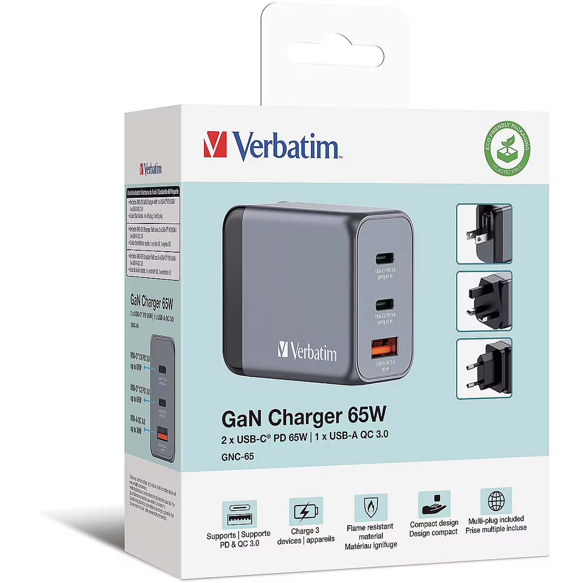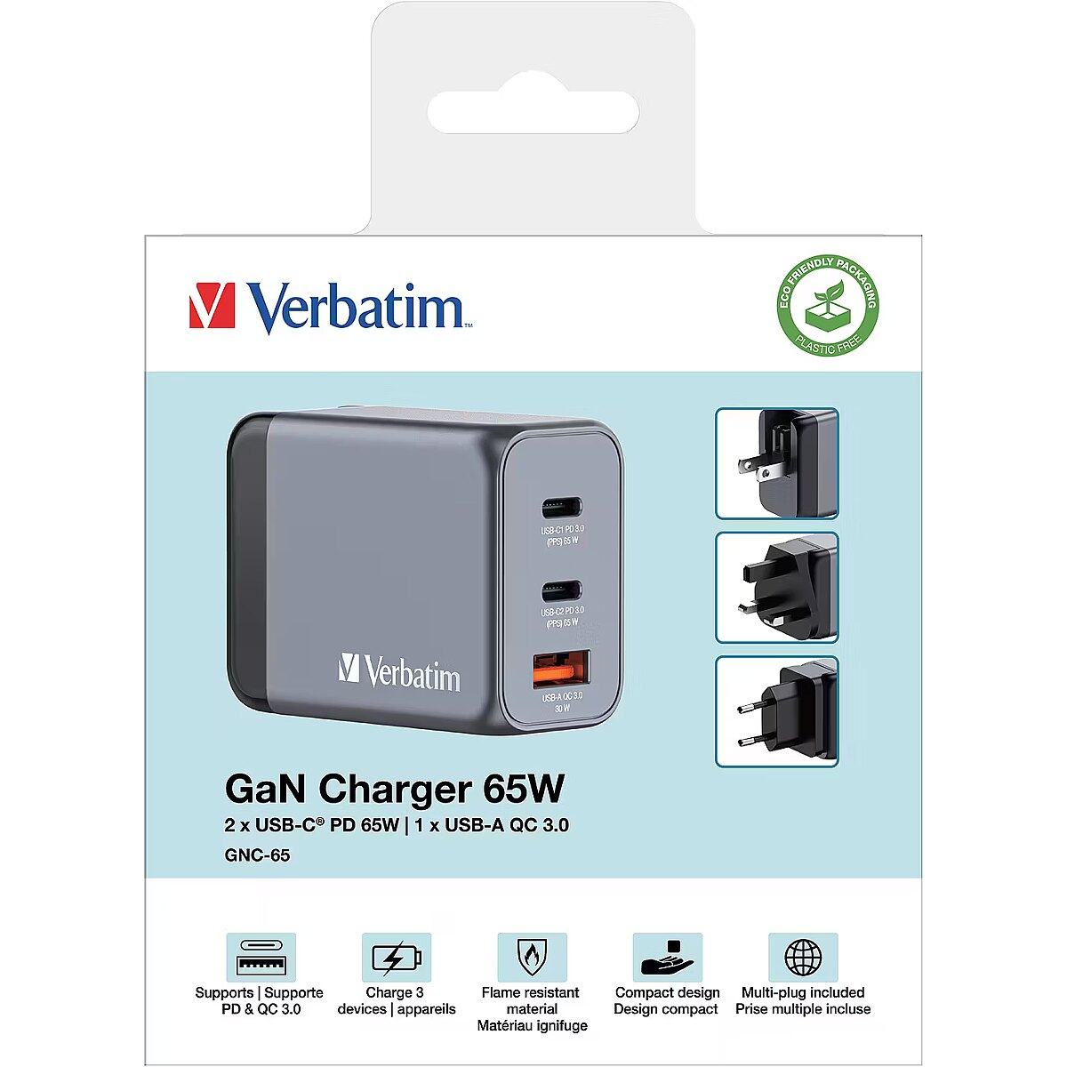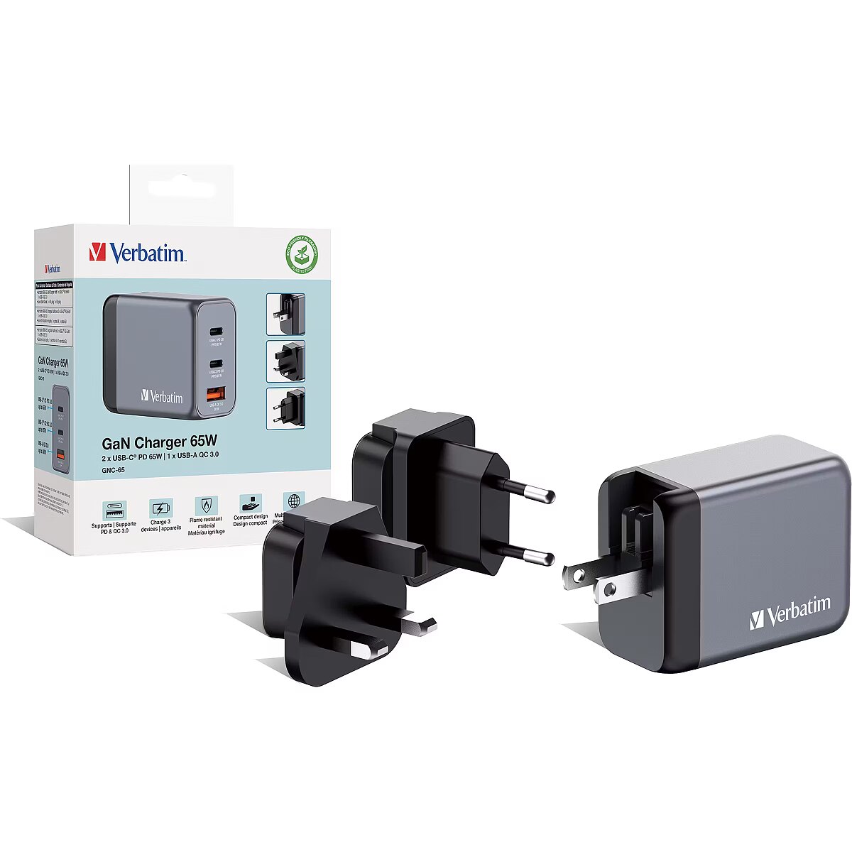 LongDesc - 65w 3-in-1 ChargingVerbatim’s 65W GaN Wall Charger combines two USB-C PD 65W ports and one USB-A QC 3.0 port in a sleek, palm sized design. Ideal for the office, home or travelling to power your laptop, tablet, smartphone, gaming devices, and more. With its foldable US prongs and replaceable EU and UK plugs, it’s the ultimate travel companion.Safe and ReliableThe GaN charger is made with high-quality, flame-resistant materials and features four safety protection systems, including over-current protection, over-voltage protection, short circuit protection, and over-temperature protection to ensure your safety while charging.