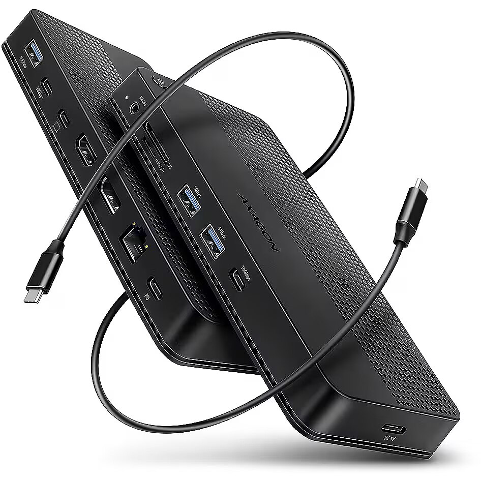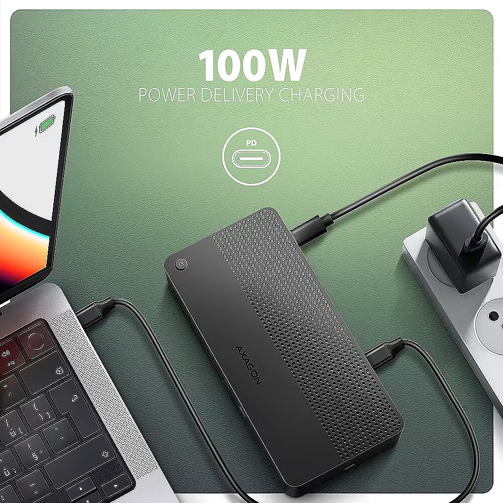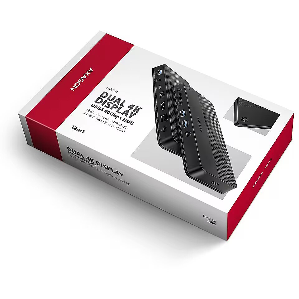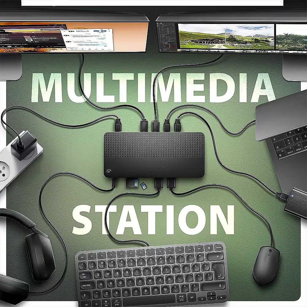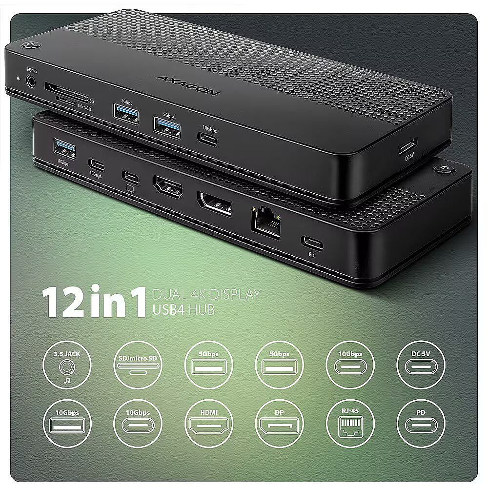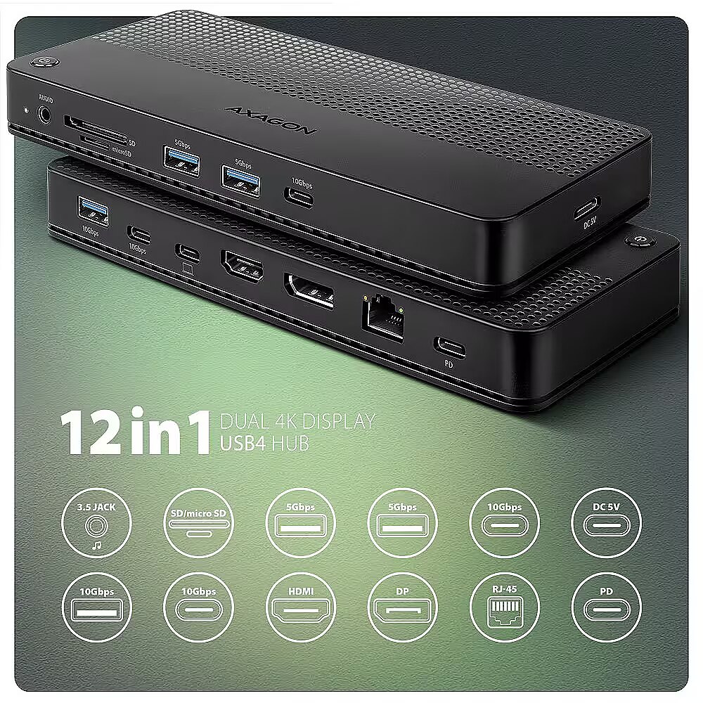 Description - AXAGON HMC-U4 USB4 40Gbps DUAL 4K DISPLAY 12in1 dock USB4 40Gbps docking station with dual 4K video output. HDMI 8K, DP 8K, PD 100W and 5 USB ports. USB-C cable 80 cm. AXAGON HMC-U4 DUAL 4K DISPLAY dock turns your laptop, tablet or phone into a multimedia centre. With the next generation USB4 technology, this docking station offers a total data throughput of up to 40 Gbps. So, you can take full advantage of even the most demanding computer accessories and enjoy a high-end experience. Whether you're watching 8K video or working with two 4K monitors simultaneously, this technology delivers the performance you need. USB4 offers the benefit of Thunderbolt compatibility while supporting backward compatibility with previous generations of USB. You will connect your laptop to the 12in1 docking station via the supplied 80 cm long cable. In no time, you have fast SD (UHS-II) and microSD card reader, and connectors for connecting two external monitors, five USB devices, headphones or headset, and Power Delivery power. However, it is necessary that the USB-C port of your mobile device supports video output (DisplayPort Alternate Mode) and Power Delivery power. HDMI and DisplayPort outputs allows you connect an external monitor, TV or projector with up to 8K/30Hz Ultra HD, 4K/144Hz Ultra HD or 2K/240Hz Quad HD resolution, with support for multi-channel audio streaming. With HDR support, you can enjoy a richer colour spectrum and sharper contrasts for an even better visual experience. By connecting two monitors simultaneously, you get resolutions up to 4K/144Hz on the DP port output and 4K/60Hz on the HDMI output. All supported resolutions and features are directly dependent on the support of the connected monitor and laptop. The docking station has a total of three 10Gbps USB-C (2x) and USB-A (1x) outputs, as well as two 5Gbps USB-A outputs. These five USB ports allow you to connect external drives, flash drives, mouse, printer and other USB accessories. The USB ports also charge mobile phones and tablets with a power of up to 7.5W. The memory card reader supports reading and writing of all versions of SD (UHS-II) and microSD (UHS-I) cards with a capacity of up to 2TB. UHS-II cards reach speeds of up to 156 MB/s (full-duplex) or 312 MB/s (half-duplex), support for older UHS-I cards (max speed 104 MB/s) is a matter of course. The card reader enables simultaneous handling of cards in both slots and direct copying between them. You can use the 3.5 mm audio output to connect stereo headphones, headset or active speakers. It is equipped with a high-quality DAC converter, which supports sampling up to 384 kHz at 24 bits. You will enjoy superior sound quality that is ideal for lossless formats such as FLAC, WMA, WAV, APE, AAC and ALAC. Gigabit network card extends your computer by a fast and stable network connection, adds the missing RJ-45 network connector or another network card. The USB-C (PD) input is designed for a suitable Power Delivery charger. This allows both your mobile device and the dock to be powered directly from the PD charger using Power Delivery 3.0 technology with up to 100W of power. With the additional power supply via USB-C input (DC 5V), you can boost the power supply when operating without a PD charger connected and connect devices with higher power consumption such as multiple external drives to the multiport hub. The button on the top of the dock is used to turn the dock on and off. Thanks to the clever design with four rubber feet, the station stays firmly in place. Elegant ribbed surface on the top leaves no fingerprints. Vents on the underside ensure sufficient air circulation so that the dock does not overheat even at higher loads.