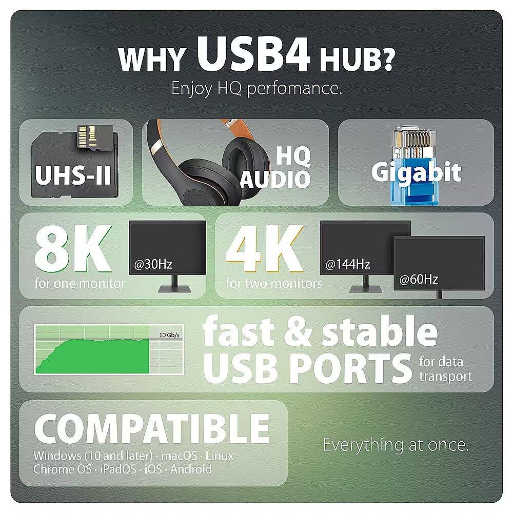 ProductDescription - HMC-U4 USB4 dock, 3x USB-A, 2x USB-C, HDMI & DP 8K/30Hz, RJ-45, SD/mSD, audio, PD