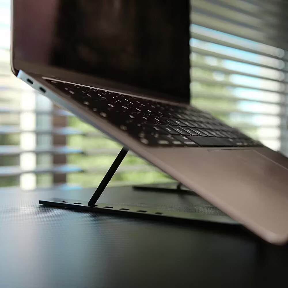 specifications: material: aluminum with silicone pads compatibility: laptops and tablets from 10″ to 17″ tilt angle: fixed ≈ 15–20° max load capacity: up to 5 kg foldable design for easy portability color: black weight: about 300 g dimensions (open): approx. 230 × 180 × 20 mm dimensions (folded): approx. 230 × 180 × 18 mm packaging: cardboard box with pouch