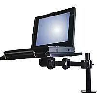 Description - The NewStar notebook desk mount, model NOTEBOOK-D100 is a tilt- and swivel desk mount for notebooks up to 22”. This mount is a great choice for space saving placement on desks using a desk clamp. They keyboard holder included stores extra keyboards if used. NewStars’ unique tilt (30°) and swivel (180°) technology allows the mount to change to any viewing angle to fully benefit from the capabilities of the notebook. The mount is manually height adjustable from 0 to 26 centimetres. Depth adjustable from 0 to 57 centimetres. A unique cable management conceals and routes cables from mount to notebook. Hide your cables to keep the workplace nice and tidy. NewStar NOTEBOOK-D100 has two pivot points and is suitable for notebooks up to 22" (55 cm). The weight capacity of this product is 15 kg each notebook. The desk mount is suitable for most notebooks. By using an ergonomic mount neck- and back complaints can be avoided. Ideal for use in offices and on counters or in a reception area. All installation material is included with the product. Screens: 1 Screen size: 10-22" Max. weight: 15 kg Depth: 0-57 cm Height: 0-26 cm Tilt: 30° Swivel: 180°