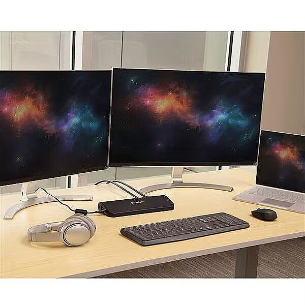 LongDesc - Maximize your productivity with this Dual Monitor USB-A Docking Station featuring Gigabit Ethernet, USB Hub, and AudioThis USB 3.0 dock combines three USB 3.0 ports, headphone and microphone audio connectors, and a Gigabit Ethernet RJ45 port, into a single docking station for maximum productivity.Display AdaptabilityOffering flexible dual video combinations right out-of-the-box, this universal laptop docking station features HDMI, DVI and VGA external monitor outputs. Each video output supports HD video resolutions (2048x1152 max) and HD video playback for an ideal solution to expanding your notebook's video capability.Available display combinations:• HDMI + VGA• HDMI + DVIIntegrated USB HubThe built-in USB hub features three USB 3.0 ports for connecting extra peripherals such as external hard drives or a wired mouse, as if they are connected directly to your laptop.Direct Ethernet ConnectivityThe integrated RJ45 Ethernet port supports speeds of 10/100/1000 Mbps, giving you an instant connection to a wired network.StarTech.com laptop docking stations can be used for cost savings and faster deployment with just a single cable. This USB 3.0 Docking Station is backed by a competitive 3-year warranty and free lifetime Technical Support.The StarTech.com Advantage