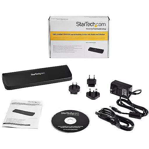 LongSummaryDescription - StarTech.com Dual-Monitor USB 3.0 Docking Station with HDMI & DVI/VGA~Dual Monitor USB 3.0 Laptop Docking Station with HDMI/DVI/VGA, 3x USB-A Hub, GbE, Audio, Universal Type-A Dock for Windows/macOS/ChromeOS - TAA Compliant. Connectivity technology: Wired, Host interface: USB 3.2 Gen 1 (3.1 Gen 1) Type-B. Ethernet LAN data rates: 10,100,1000 Mbit/s, Copper ethernet cabling technology: 1000BASE-T, 100BASE-TX, 10BASE-T, Networking standards: IEEE 802.3, IEEE 802.3ab, IEEE 802.3u. Product colour: Black, Data transfer rate: 5 Gbit/s, Maximum digital resolution: 1920 x 1200 pixels. AC input voltage: 100-240 V, Input current: 0.9 A, Output voltage: 5 V. Windows operating systems supported: Windows 10, Windows 10 Education, Windows 10 Education x64, Windows 10 Enterprise, Windows 10..., Mac operating systems supported: Mac OS X 10.11 El Capitan, Mac OS X 10.12 Sierra, Mac OS X 10.14 Mojave, Mac OS X 11.0 Big Sur,..., Other operating systems supported: ChromeOS