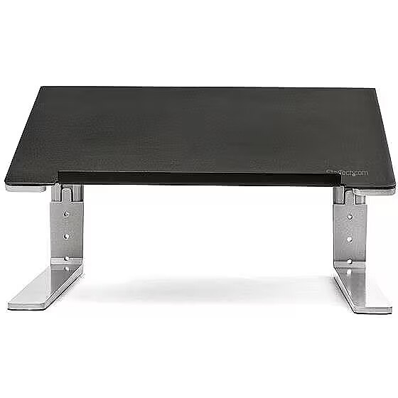 LongDesc - Ergonomic Laptop Riser | Steel & Aluminum | TiltedWork in greater comfort with this height adjustable laptop stand. It raises your laptop off your desk or table surface, helping to encourage good posture and reduce neck and eye strain. Stable Laptop Stand Made of Heavy-duty Steel and Aluminum The stylish and heavy-duty laptop riser, with its 2.5 mm thick steel platform and robust aluminum legs, provides a stable surface for your notebook. The large platform size (14.1” x 9.8” / 35.7 cm x 25 cm) supports most laptop sizes including 17”, with a weight capacity of up to 22 lb. (10 kg). There is ample room underneath to store items like your external hard drive. Adjust your Laptop to the Desired Height Create a workstation that works best for you. Simply use the thumbscrews to adjust the height of the legs on the laptop riser to suit your needs. Choose from three height settings, to raise the back of the platform off the surface of your desk: 7.3”, 8.3”, or 9.3” (18.5 cm, 21 cm, or 23.5 cm). Tilted for Ideal Viewing To provide a comfortable viewing angle. The ergonomic laptop stand is tilted slightly downward 22 degrees allowing an optimum incline for typing. The raised lip (0.5” / 12.7 mm high) on the front of the platform helps to prevent your laptop from sliding off the surface. Easy Assembly It takes only minutes to set up the notebook stand. Cable management channels in the back keep your cables neat and organized. The non-skid rubber feet protect your work surface from scratches. LTSTND is backed by a StarTech.com 5-year warranty and free, lifetime technical support. The StarTech.com Advantage- Ergonomic stand raises your laptop off your desk, with tilted angle for comfortable viewing- Height adjustable with three settings, raising the legs: 7.3”, 8.3”, or 9.3” (18.5 cm, 21 cm, or 23.5 cm)- Heavy-duty steel platform (2.5 mm thick) and aluminum legs provide a stable platform, with weight capacity of 22lb. (10 kg)