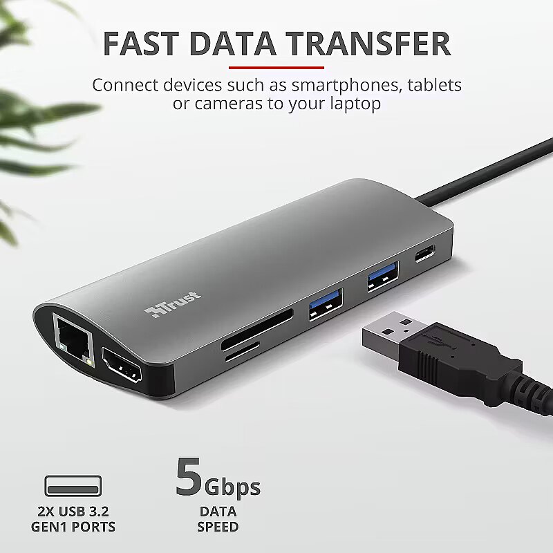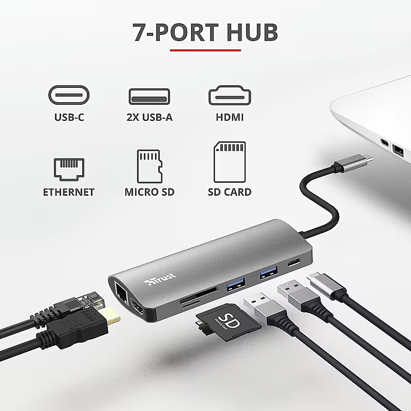 LongDesc - Stylish aluminium multi-port adapter to add HDMI, network, card reader, USB-C and USB ports to your laptop using a single USB-C connection.Connectivity Equals ProductivityThin laptops are great, but their lack of connection ports can be a problem. Well, no more. With the Trust Dalyx 7-in-1 Adapter your productivity will increase seven-fold thanks to the included HDMI, Ethernet, memory card, USB and USB-C connections.Fast Data TransfersBecause of the fast connection types on the Dalyx 7-in-1 Adapter you’ll transfer files with a speed of up to 5Gbps via USB. Or use the Ethernet port to connect your laptop to your home or office network for fast Internet access. And because of the HDMI 1.4 connection, you can even connect a 4K monitor with HDR so your photos look more colourful than ever.With Powerful PassthroughBy connecting the Dalyx to the USB-C port on your laptop, you won’t even lose the ability to charge the battery. One of the seven ports is a USB-C connector that supports a power input of up to 5A/100W making it very suitable to pass through the electricity of your power supply.Always On The GoIf you are constantly on the move, the Trust Dalyx 7-in-1 Adapter won’t slow you down one bit. Its small form factor, combined with the sturdy aluminium housing, means you’ll take it anywhere you’ll go. It doesn’t need an additional power supply and when you’re out on a photoshoot or even on vacation, the included card reader will make sure you can back-up your pictures without hassle.