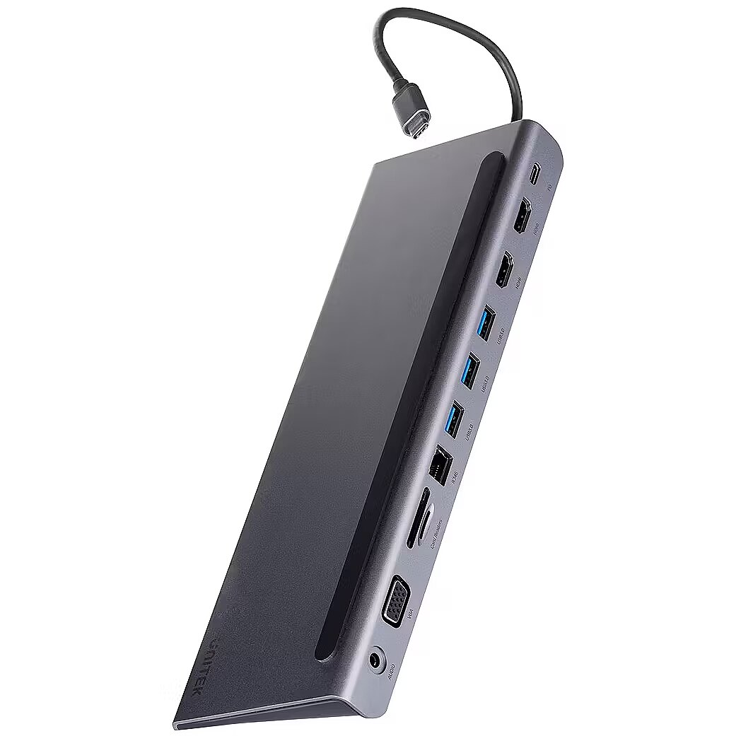 Description - Nowe możliwości Stacja dokująca znacznie zwiększa możliwości, umożliwiając podłączenie aż do 11 dodatkowych urządzeń. Dzięki zróżnicowanym portom sprosta wymaganiom Twojego stanowiska pracy oraz rozrywki. Wystarczy podłączyć ją klasycznym przewodem USB-C. Porty, które zawiera stacja dokująca to: 3x USB-A (do 5Gbps) 2x HDMI (do 4K 30Hz) 1 x VGA 1x USB-C z Power Delivery (ładowanie 100W) 1x czytnik kart SD 1x czytnik kart microSD 1x RJ45 Ethernet 1x 3.5mm jack audio Trzy ekrany Stacja dokująca oferuje możliwość wyświetlania na trzech ekranach jednocześnie poprzez dwa złącza HDMI oraz VGA, dzięki któremu możesz podłączyć rzutnik. W ten sposób nie tylko stworzysz prywatne kino, ale i zapewnisz dodatkową atrakcję dla odwiedzających Cię znajomych, zapraszając ich do wspólnej rozgrywki w ulubioną grę. Szybkie ładowanie Stacja jest wyposażona w technologię Power Delivery o mocy 100W, co oznacza, że można wydajnie ładować komputer przewodem podłączonym do portu USB C. Nawet jeśli masz tylko jeden port USB-C w ultrabooku, nie musisz iść na kompromisy i decydować co jest ważniejsze. Lepsza ergonomia Wykorzystanie aluminium w obudowie urządzenia pozwala na skuteczne odprowadzanie ciepła. Dzięki temu masz pewność, że nawet korzystając ze wszystkich portów jednocześnie, Twoim urządzeniom nie grozi przegrzanie. Projekt urządzenia sprawia, że można również użyć go jako podstawki pod laptopa, zwiększając ergonomię stanowiska pracy. Jakość gwarantowana Unitek jest pewien jakości swoich produktów, dlatego wszystkie urządzenia w Polsce są objęte dożywotnią gwarancją dystrybutora. Oznacza to, że w przypadku ewentualnych problemów technicznych, możesz odesłać sprzęt do serwisu za pomocą pobliskiego paczkomatu. Odwiedź lokalną stronę marki Unitek, żeby dowiedzieć się więcej lub uzyskać pomoc techniczną. Dostępne porty: 3x USB-A (do 5Gbps) 2x HDMI (do 4K 30Hz) 1 x VGA 1x USB-C z Power Delivery (ładowanie 100W) 1x czytnik kart SD 1x czytnik kart microSD 1x RJ45 Ethernet 1x 3.5mm jack audio