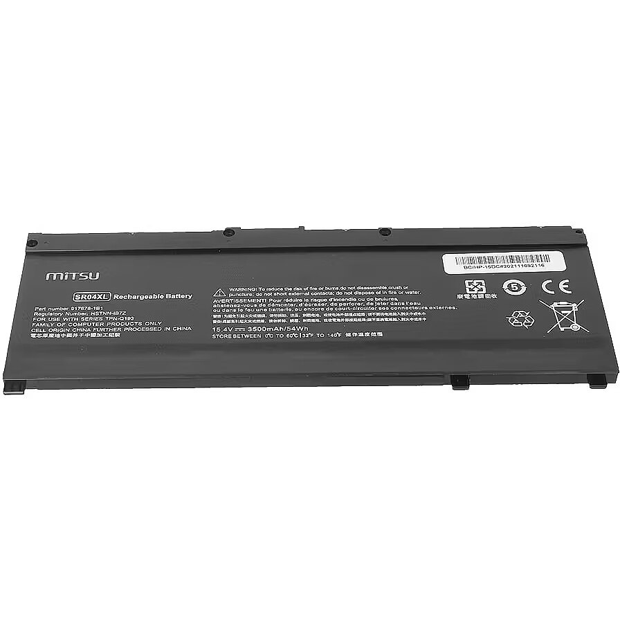 Description - Mitsu Battery for HP Omen 15-DC 3500 mAh (54 Wh) 15.4 Volt - 5BM723 Model BC/HP-15DC High quality at a reasonable price, safety and ecology are the features of MITSU batteries that have already been appreciated by thousands of Europeans, mainly in Poland, the Czech Republic and Slovakia. It is the result of combining the best components with attention to every stage of the production process, supported by constant quality control, as well as an emphasis on device safety. MITSU is: High-end, proven, ecological class A lithium-ion cells Actual declared capacity Much slower decline in nominal capacity compared to other cheaper alternatives Low susceptibility to spontaneous discharge No memory effect Factory protections against overcharge and deep discharge, as well as against overvoltage OVP, overheating OTP, SCP short circuit and OCP current overload Reliable and long-lasting time between recharges 6-step quality control. By buying this laptop battery, you can also be sure that you care for the environment at the same time. The manufacturer closely cooperates with organizations dealing with broadly understood environmental education, supporting selective collection and maximum recovery of waste. MITSU batteries are CE, ROHS and ISO9001 certified products. Replaces batteries: HSTNN-DB8Q, HSTNN-IB8L, L08855-855, L08934-1B1, L08934-2B1, L08934-2C1, SR03XL, TPN-C133, TPN-C134, TPN-Q194, Model BC/HP-15DC Fits: HP 2EF91PA, 2EF92PA, 2EF93PA, 2EF94PA, 2EF95PA, 2EF96PA, 2EF97PA, 2EF98PA, 3KS69PA, 3KS70PA, 3KS71PA, Pavilion series 15-CB045WM, 15-CE015DX,