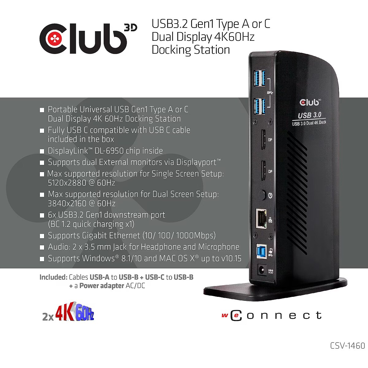 Description - USB3.2 Gen1 Type A or C Dual Display 4K60Hz Docking Station The Club 3D CSV-1460 USB3.2 Gen1 Type A or C Dual Display 4K 60Hz Docking Station is designed to satisfy all your connectivity demands. It provides no less than 6 USB3.2 Gen1 Ports, Headphone- and Microphone- connection, Gigabit Ethernet port and 2 x Displayport™4K60Hz outputs.It is fully USB C compatible and a USB3.2 Gen1 Type C to USB3.2 Gen1 type B cable is included in the box. With this CSV-1460 you can now connect two screens at 3 840x2160 UHD at 60Hz resolution to almost all existing Notebooks or Tablets just by using a single USB3.2 Gen1 Type A or C port! Featuring the advanced DisplayLink™ DL-6950 chip, you can even connect one screen at a resolution of 5K at 60Hz! The USB3.2 Gen1 Type A or C Dual Display Docking Station has a convenient design and detachable stand, allowing it to be placed on your desk in horizontal- or vertical position. It's a productivity enhancing tool for any power user working in a (semi) professional environment. Dual Mode DisplayPort™: The USB3.2 Gen1 Type A or C Dual Display 4K 60Hz Docking Station has 2 Displayport™++ outputs or in other words, Displayport™ 1.2 Dual Mode. This means that for the conversion of the video signal to DVI or HDMI™ passive cables or adapters must be used.