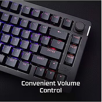 HyperX lineārie slēdži nodrošina izcilu stabilitāti, pateicoties POM kātam ar pussienām. Šie slēdži ir paredzēti līdz pat 80 miljoniem taustiņu nospiešanu, un tiem ir iepriekš instalēti HyperX PBT taustiņu vāciņi. Ērta skaļuma kontrole