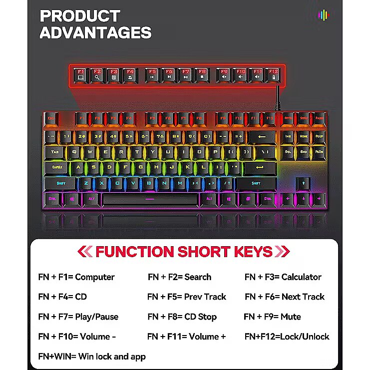 Key Features: 87 Keys: A full set of 87 keys optimized for typing and gaming, offering a comfortable and responsive experience. 20 Backlight Modes: Personalize your setup with 20 different backlighting modes, including dynamic effects and static lighting, to suit your style or create the perfect atmosphere. Function Short Keys: FN + F1 = Computer FN + F2 = Search FN + F3 = Calculator FN + F4 = CD FN + F5 = Previous Track FN + F6 = Next Track FN + F7 = Play/Pause FN + F8 = CD Stop FN + F9 = Mute FN + F10 = Volume - FN + F11 = Volume + FN + F12 = Lock/Unlock FN + WIN = Win lock and app 1.5m Cable Length: The keyboard comes with a 1.5-meter long cable, providing flexibility in positioning your setup. 100% Anti-Ghosting: Each key can be registered quickly and accurately, even when multiple keys are pressed simultaneously, ensuring flawless performance during intense gaming or typing sessions. N-Key Rollover: With N-key rollover, you can press multiple keys at the same time without missing a single input, making it ideal for fast-paced games and high-performance tasks. The K80 is a versatile and functional keyboard, combining mechanical precision with customizable features to improve your overall experience, whether at work or play.