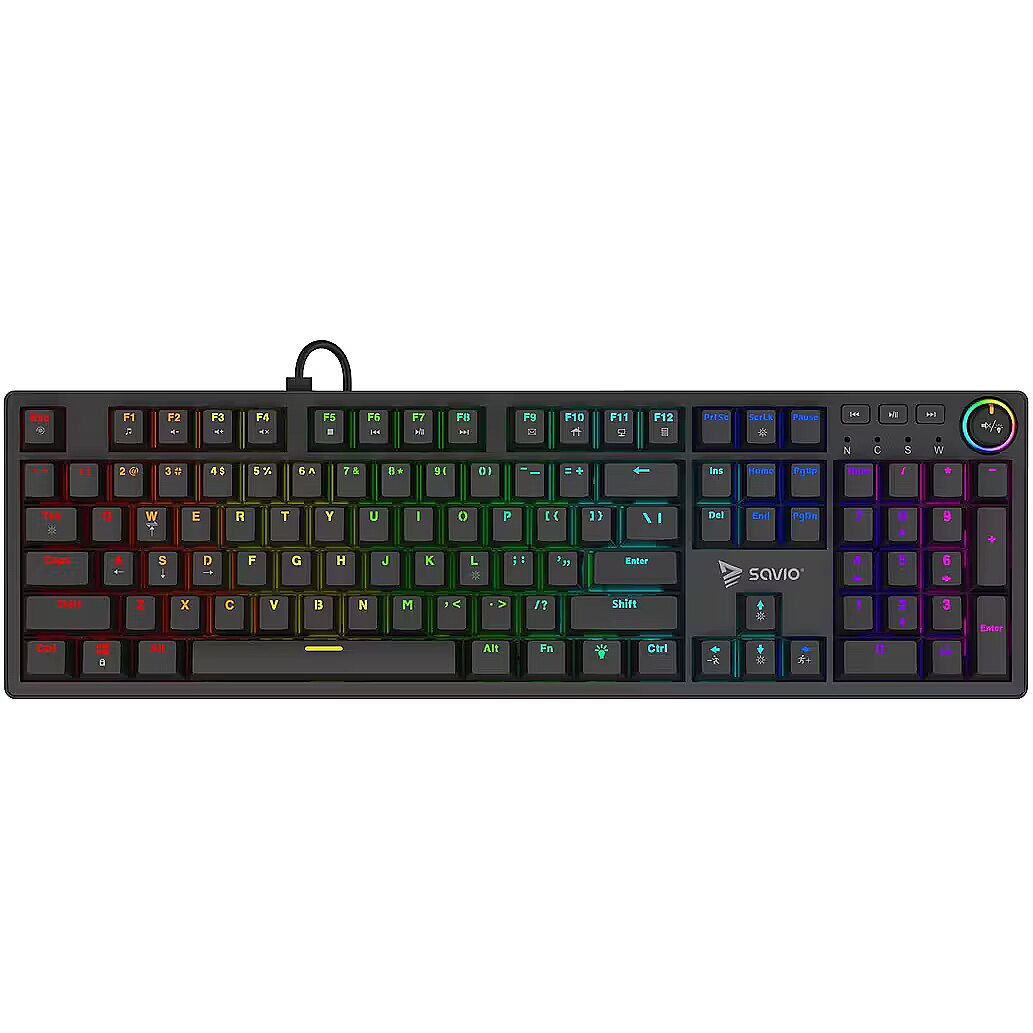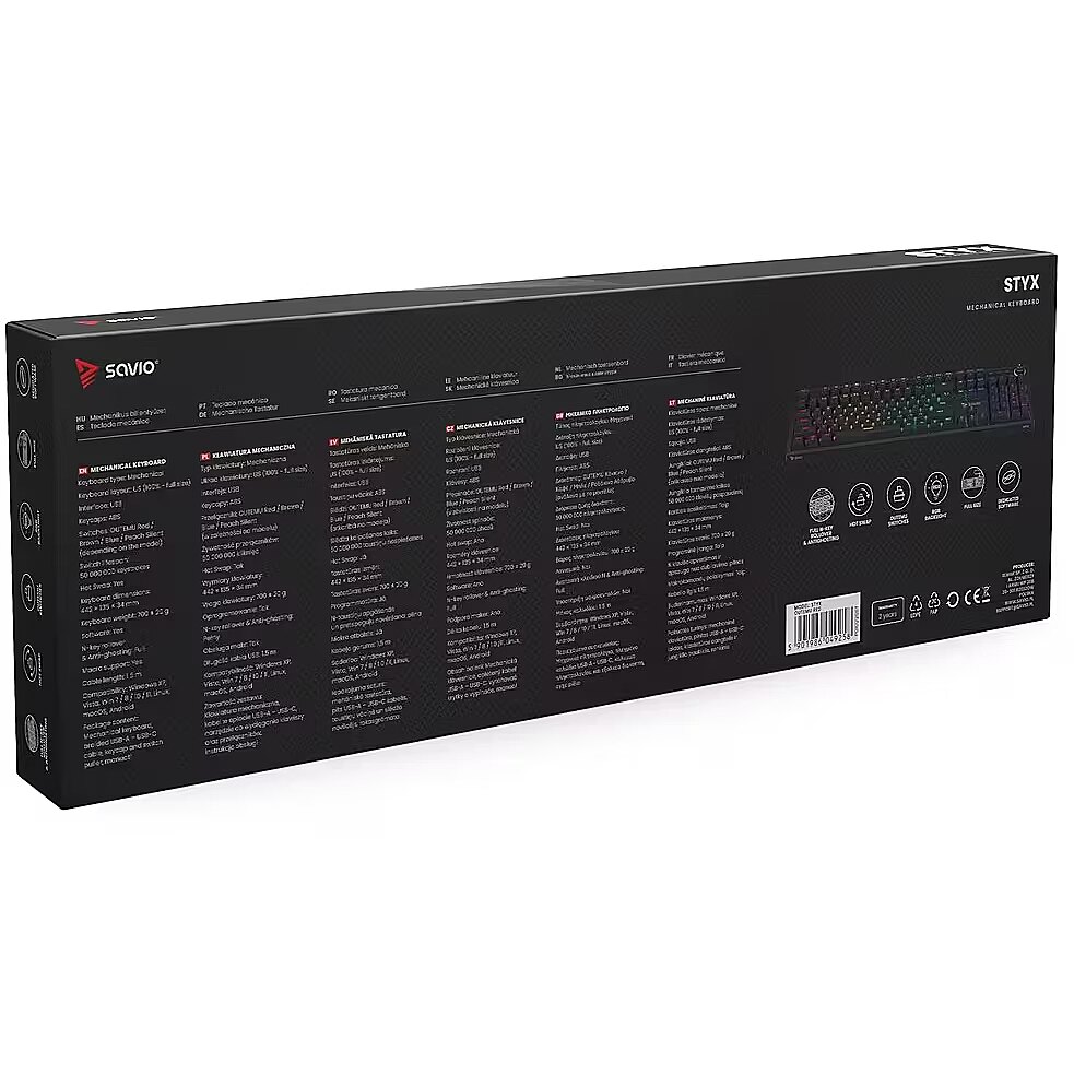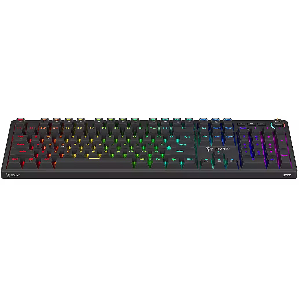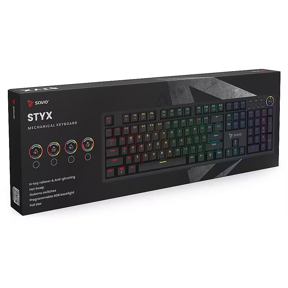 Description - Mechanical keyboard STYX OUTEMU BLUE Savio STYX is a full-size mechanical keyboard created for gamers and professionals who dont accept compromises. It combines everyday comfort with gaming-grade performance and striking design. With rich personalization, high durability, and modern features, STYX excels both in gameplay and at work. Full N-Key Rollover & Anti-ghosting The Savio STYX features N-key rollover  the ability to register many key presses simultaneously. In addition, Anti-ghosting (eliminating false signals from keys that werent actually pressed) ensures maximum precision. Even the most dynamic key combinations in games or office work are captured flawlessly. Hot-swap Function STYX offers Hot-swap (the ability to replace switches yourself without soldering). In just moments you can swap to different switches to tailor the keyboards feel to your needs no specialized tools required. Its a perfect solution for anyone who wants to experiment with various switch types or easily replace worn parts. OUTEMU BLUE Switches clicky precision and clear feedback In the version with OUTEMU BLUE switches (i.e., clicky, tactile mechanical switches with a noticeable actuation bump and an audible click), STYX delivers very clear feedback with every press. Its a great choice for typing and office workthe distinct bump helps you hit the actuation point precisely, while the springy return supports rhythmic, fast text entry. In games, they provide an unmistakable actuation signal, though they are louder than linear or brown variants. The switches are rated for 50 million keystrokes. 21 RGB Lighting Modes The keyboard offers full RGB (Red, Green, Blue) backlighting with 21 modes to choose from. From static effects to dynamic animations you can easily match the lighting style to your mood, game, or desk aesthetic. Full-size Layout STYX is a full-size keyboard with a complete key layout, including a numeric keypad and dedicated multimedia keys. This gives you maximum functionality whether youre gaming, working, or editing media. An additional advantage is the multifunctional knob, which lets you adjust volume and lighting without using key shortcuts. Specification Keyboard type: Mechanical Keyboard layout: US (100% - full size) Interface: USB Keycaps: ABS Switches: OUTEMU Red / Brown / Blue / Peach Silent (depending on the model) Switch lifespan: 50 000 000 keystrokes Hot Swap: Yes Keyboard dimensions: 442 x 135 x 34 mm Keyboard weight: 700 20 g Software: Yes Length: 1.5 m Compatibility: Windows XP, Vista, Win 7 / 8 / 10 / 11, Linux, macOS, Android Package content: Mechanical keyboard, braided USB-A USB-C cable, keycap and switch puller, manual