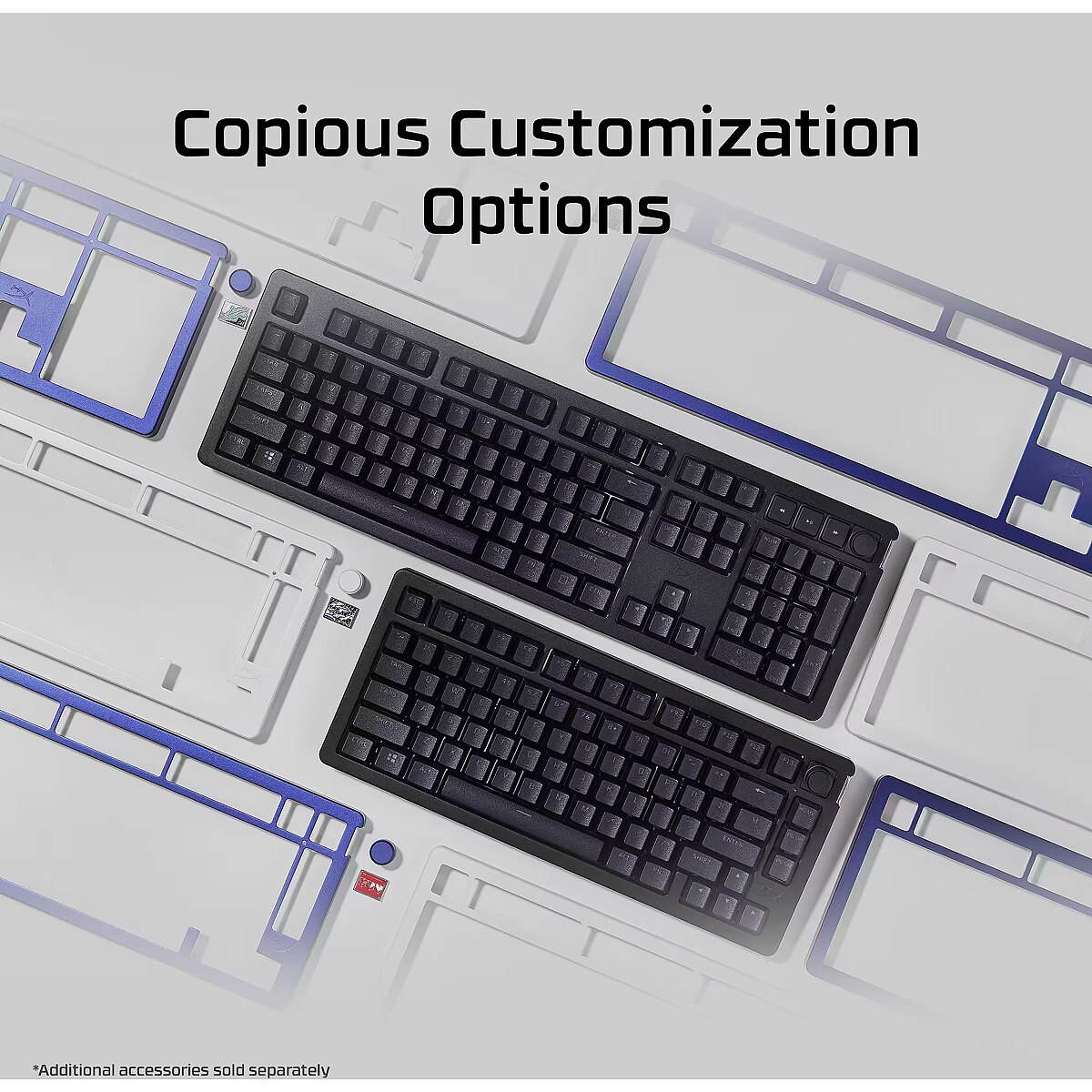 LongDesc - The gaming keyboard, elevated.As the world's most customizable toolless mechanical gaming keyboard on the market[5], the HyperX Alloy Rise takes personalization to the next level. Not only can you hot swap in key switches, but also magnetic top plates, badges, and more. All that customization is built onto the Alloy Rise’s solid frame and ultra-responsive 8k polling rate. Out of the box, this keyboard features pre-lubed HyperX Linear Switches rated for up to 80 million keypresses1 as well as pre-installed HyperX PBT Keycaps. You’ll also get an upgraded RGB experience courtesy of the ambient light sensor that auto-adjusts the brightness, 10 keyboard profiles saved directly to the keyboard, and powerful customization via HyperX NGENUITY Software. Get one step closer to your endgame with the HyperX Alloy Rise.