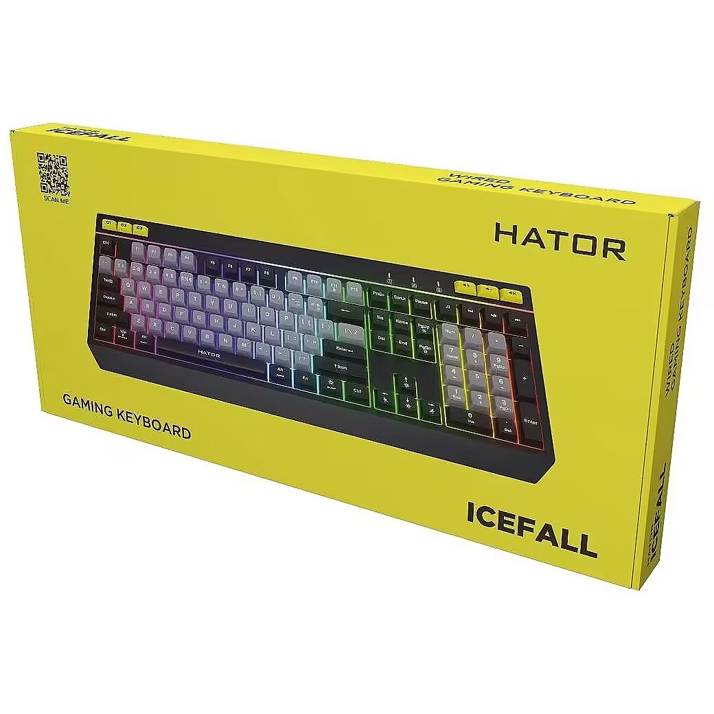 LongDesc - HATOR Icefall full-size membrane keyboard is an ideal choice for those who appreciate convenience and high performance. With quiet operation, a wide range of functions, a thoughtful design and rich RGB lighting, this keyboard is suitable for a variety of usage scenarios.The membrane ensures silent operation of the buttons, which is important in many situations. The softness and quiet pressure of the keys create a comfortable environment for busy work and games.Keycaps with a UV coating and laser engraving will provide greater resistance to erasing symbols and better protection against wear and tear due to frequent use.The keyboard is equipped with keys for controlling multimedia. This allows you to quickly and conveniently control music playback and other functions without distracting from thу work or game.Icefall has separate buttons for quickly switching between memory profiles. Save your settings and macros and activate them in one click, depending on the current tasks. And also use these profiles on any computer without the need to reconfigure them.HATOR Icefall has bright RGB lighting with the ability to adjust for 8 separate zones. Eight preset lighting effects and a custom mode are available for individual customization. This allows you to create a unique atmosphere and emphasize individual style.The keyboard has two height levels, which allows you to choose the optimal position for comfortable work and games. This feature reduces stress on your wrists and ensures long-term use without fatigue.The software allows you to create and save macros, making it easier to create complex commands. This is especially useful for gamers and professionals who require high speed and accuracy.