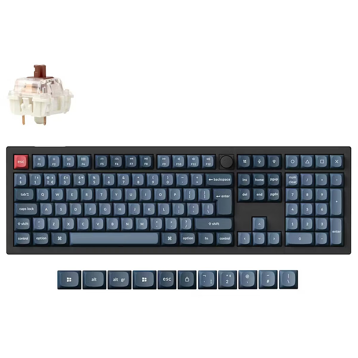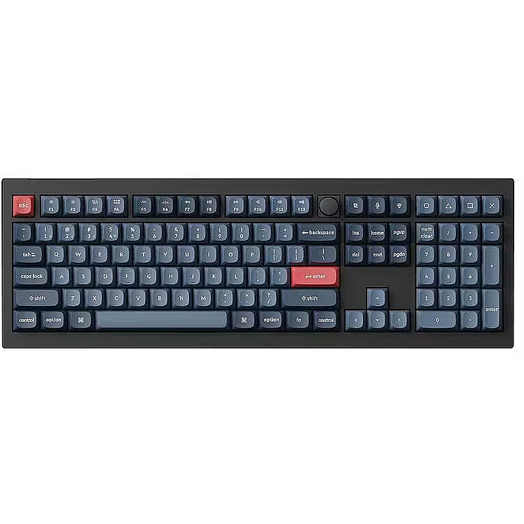 Summary - Keychron V6 MAX. Keyboard form factor: Full-size (100%). Keyboard style: Straight. Connectivity technology: Wireless, Device interface: RF Wireless + Bluetooth, Keyboard key switch: Mechanical. Backlight type: RGB LED. Recommended usage: Universal. Product colour: Black, Dark Blue