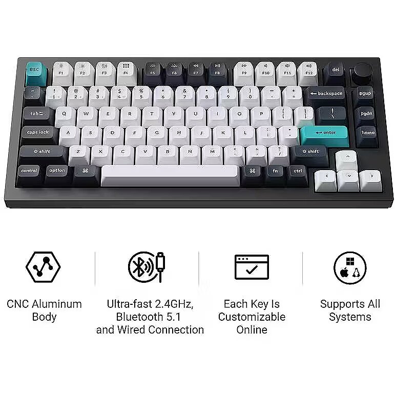 Summary - Keychron Q1 Max. Keyboard style: Straight. Connectivity technology: Wired & Wireless, Device interface: USB + RF Wireless + Bluetooth, Keyboard key switch: Mechanical, Keyboard layout: QWERTY, Keyboard number of keys: 81. Backlight type: RGB LED. Recommended usage: Gaming. Product colour: Black, Cyan, Dark Blue, White