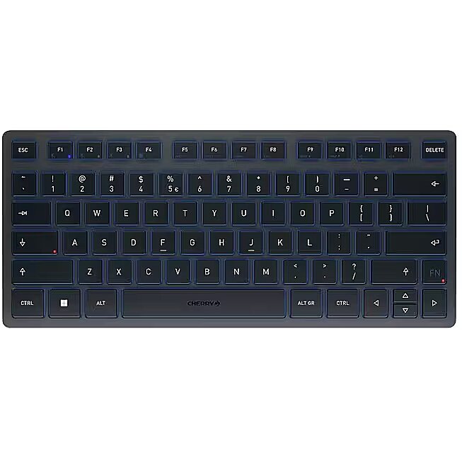 LongDesc - The CHERRY KW 7100 MINI BT is a compact Bluetooth® wireless keyboard that is perfect for use on the go. Ideal for both personal and professional purposes: The multi-device keyboard can be connected to up to three different devices at the same time. The carry case provided makes the keyboard easy to store and transport, meaning it is always ready for use.The three Bluetooth® 5.1 channels enable use with multiple devices. You can easily switch between the equipment you have connected and control whichever device you need by simply pressing the F1 to F3 keys. The KW 7100 MINI BT is compatible with virtually any Bluetooth®-enabled device, including desktop PCs, notebooks and tablets*.*Supported operating systems: Windows; Android™ and Chrome OS with some restrictionsOur CHERRY SX scissor mechanism guarantees precision. The slightly concave keys resemble a laptop keyboard and enable smooth and effortless typing — all while making very little noise.The CHERRY KW 7100 MINI BT is not only an ideal choice because of its excellent typing features, but also because of its minimalist design. Due to its compact dimensions, the keyboard takes up very little space on your desk — meaning that the MINI version is also ideal for working on the go in places where there is less work space available, such as in cafés or at university. The compact keyboard can even offer ergonomic advantages: The arm used to operate the mouse can be kept closer to the keyboard, which creates an improved shoulder posture and can prevent tension.A closer look at the keys shows many special functions. The FN key not only provides access to Bluetooth® channels, image adjustment and volume control, but can also be used for multimedia functions such as play/pause and track selection. If you need to use these special functions permanently, the FN key can be locked with the simplepress of a key.The status LEDs integrated into the keys indicate whether the FN-Lock key is activated, as well whether the Caps Lock key is activated and which Bluetooth® channel is currently in use. The CHERRY KEYS software can be used to assign your desired function to each key and is available to download free of charge.The keyboard is delivered in completely plastic-free packaging, and also comes with a black carry case made of recycled plastic. The compact size of the KW 7100 MINI BT means it can be easily carried in a bag and can also be transported safely and securely from one place of use to another.The CHERRY KW 7100 MINI BT boasts a minimalist design, ultra-slim dimensions, multi-device functionality and ergonomic benefits. With all these features, the wireless compact keyboard is in no way inferior to a full-size keyboard.