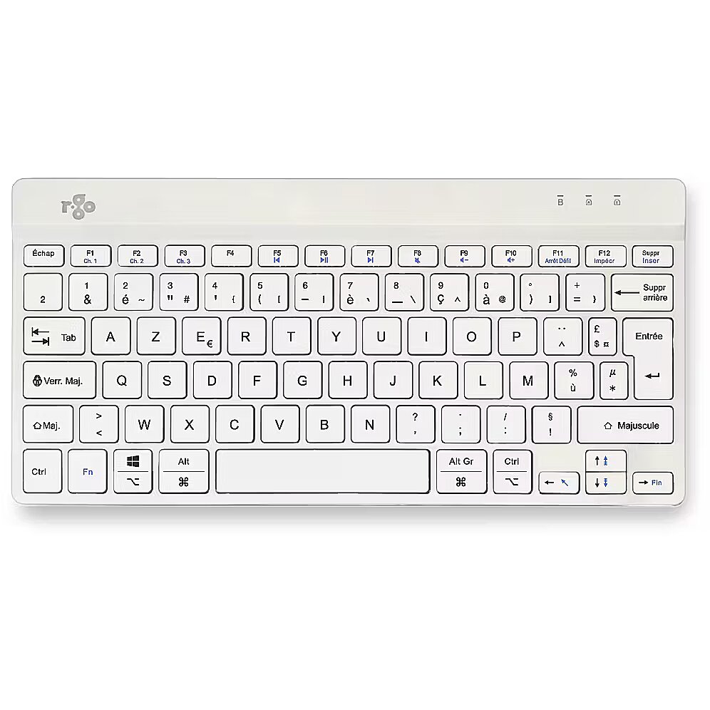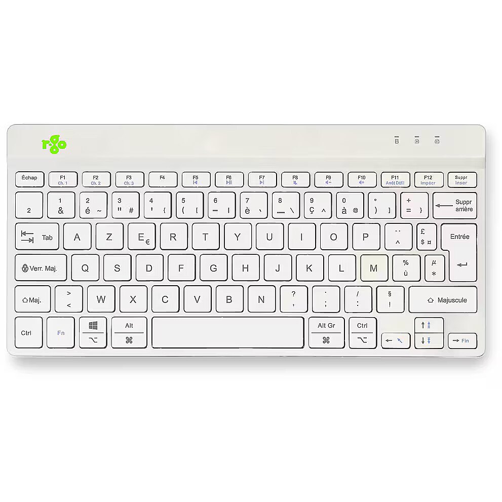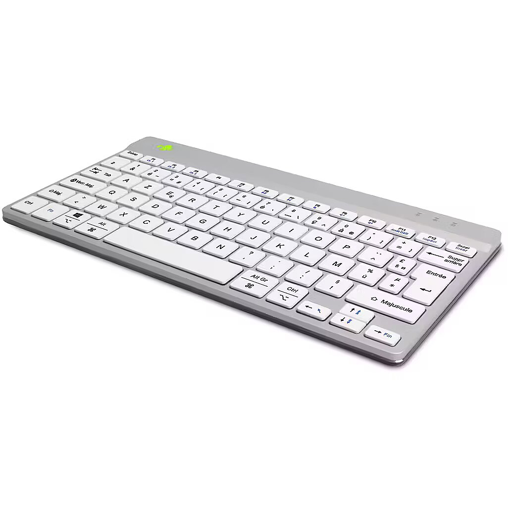 ShortSummaryDescription - R-Go Tools Ergonomic keyboard R-Go Compact Break, compact keyboard with break software, AZERTY (FR), Bluetooth, white, Mini, Wireless, Bluetooth, Scissor key switch, AZERTY, White