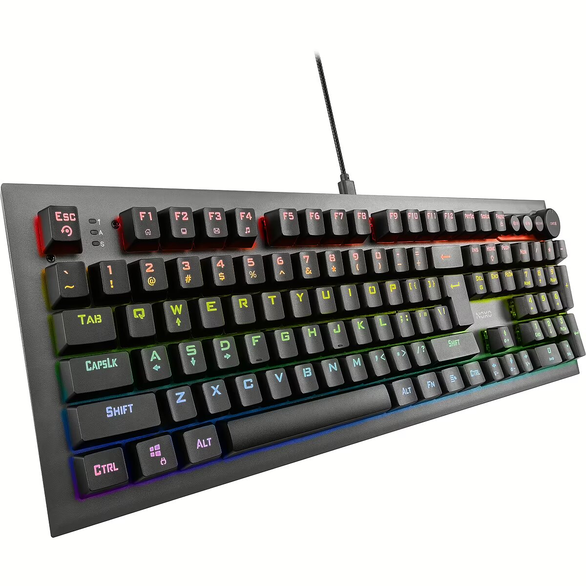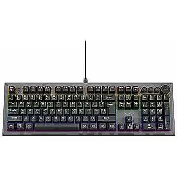 Technical details > Other features - Mechanical switches with noticeable tactile and audible feedback; Long lasting double injection keys; Individually backlit keys with dynamic lighting effects and rainbow illumination; Customisable backlight presets; Gaming mode; Multimedia control keys accessible via the FN key; Multi-purpose digital knobs for brightness and volume control; Metal body and raised keys; Two height options with double feet; Detachable cable and magnetic palm rest