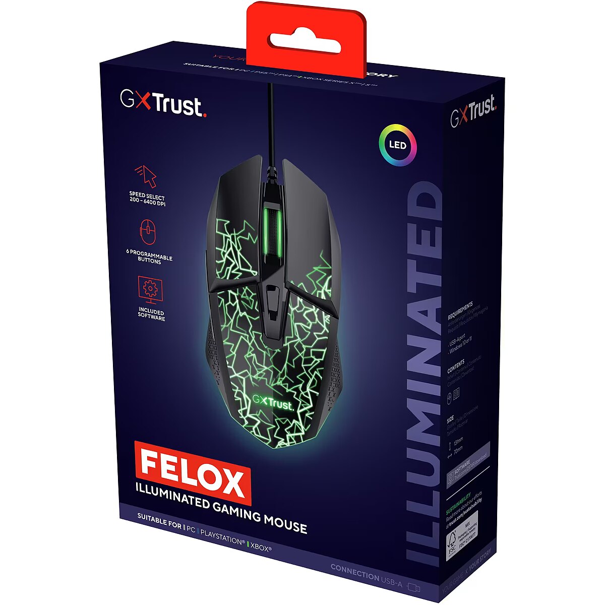 LongSummaryDescription - Trust GXT 113 Felox. Form factor: Right-hand. Movement detection technology: Optical, Device interface: USB Type-A, Movement resolution: 6400 DPI, Buttons quantity: 6, Scroll type: Wheel. Illumination colour: Multi. Power source: Cable. Product colour: Black