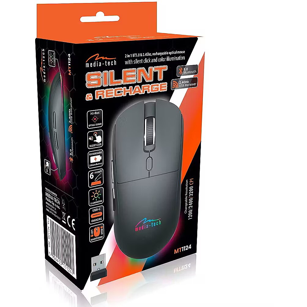 Model - Wireless 2-in-1 mouse (BT/RF) SILENT & RECHARGE MT1124 Wireless 2-in-1 BT 5.0 and 2.4Ghz optical mouse with rechargeable battery, multi-color backlight and silent click.