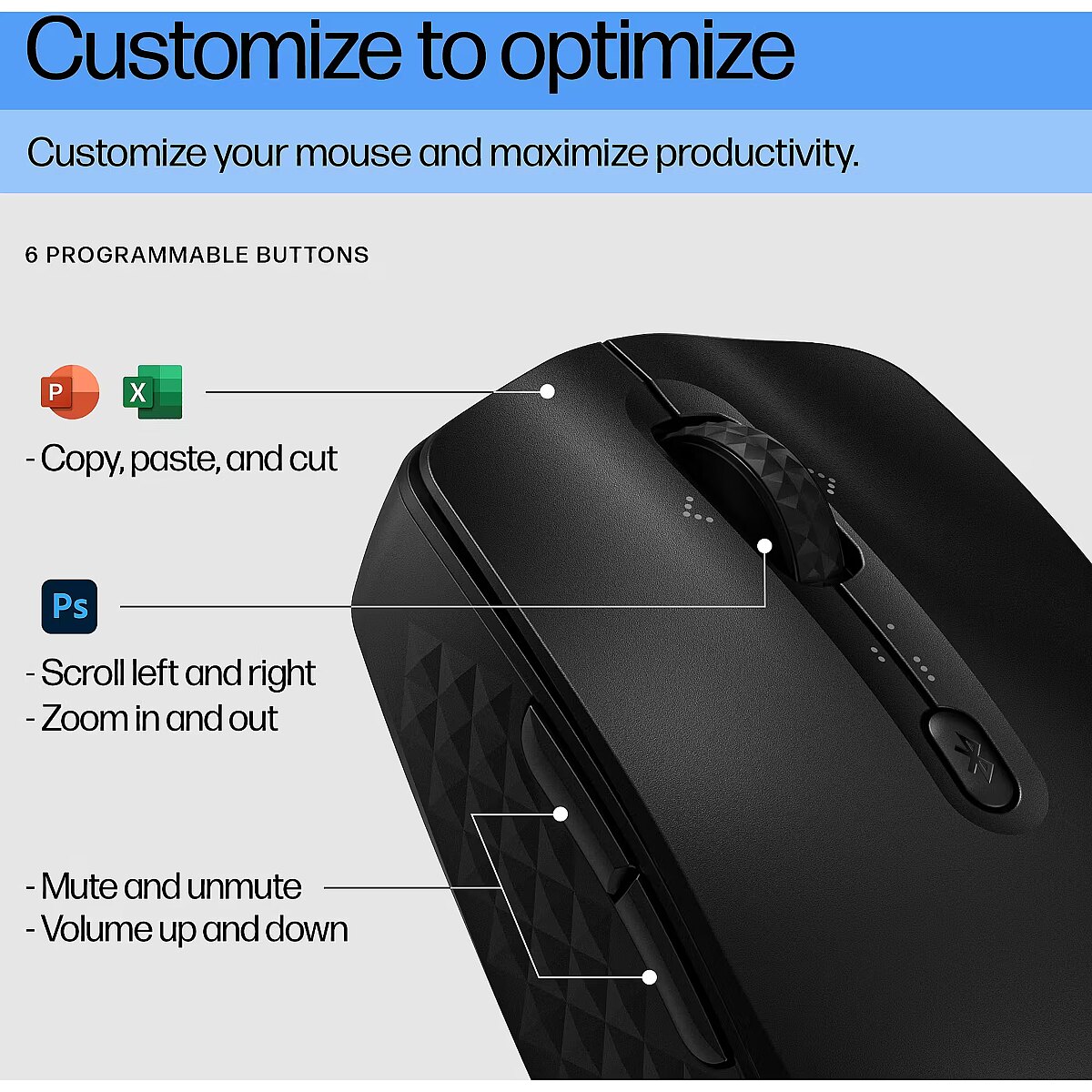Customize your mouse settings to best suit the way you work. Download the HP Accessory Center app and program six buttons for the best settings for your workflow and maximum productivity. The 4-D tilt scroll wheel allows for easy horizontal scrolling.
