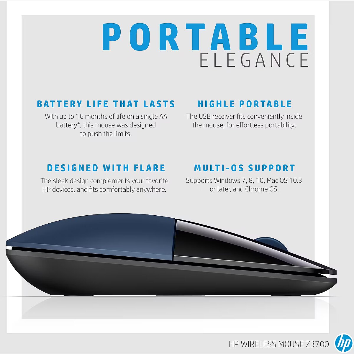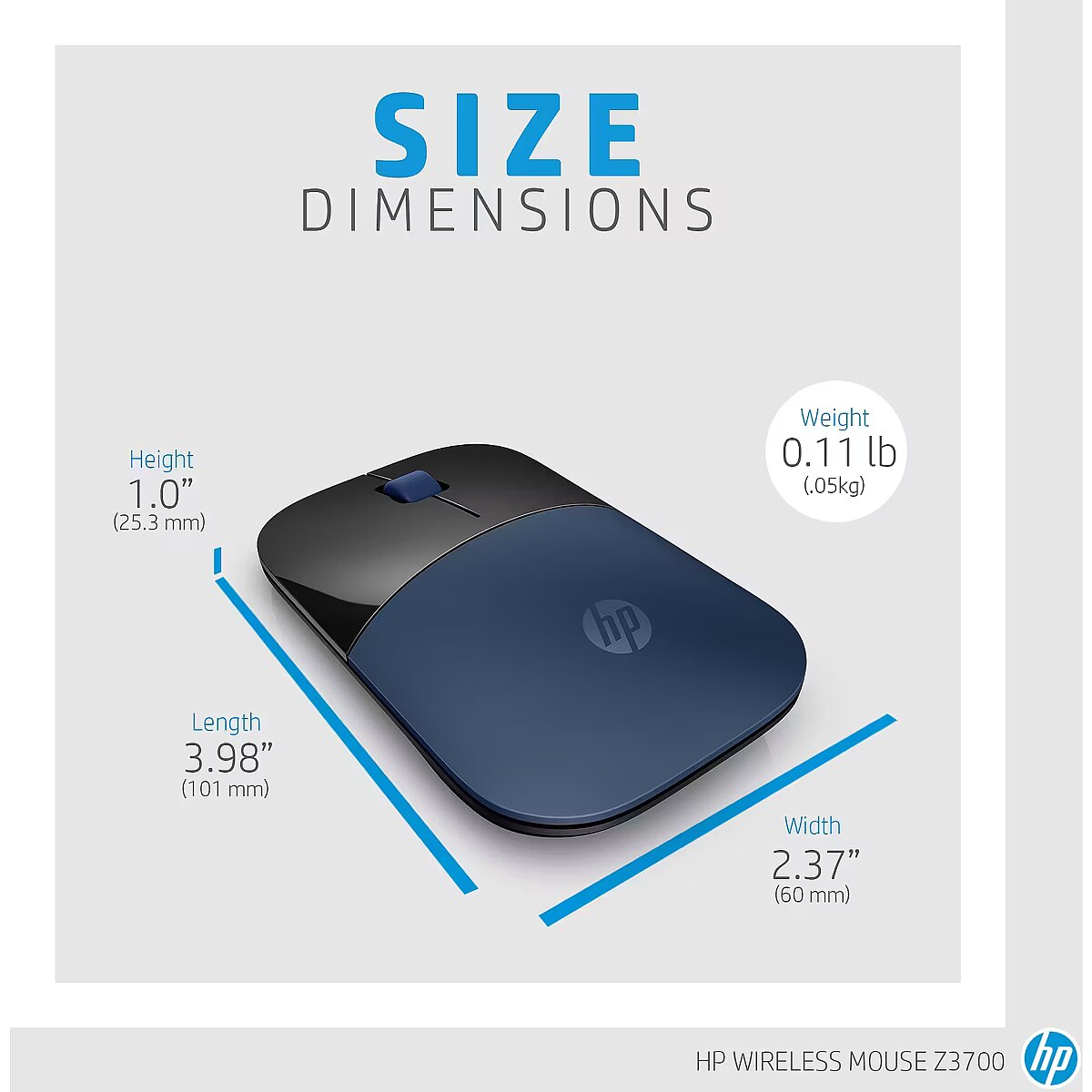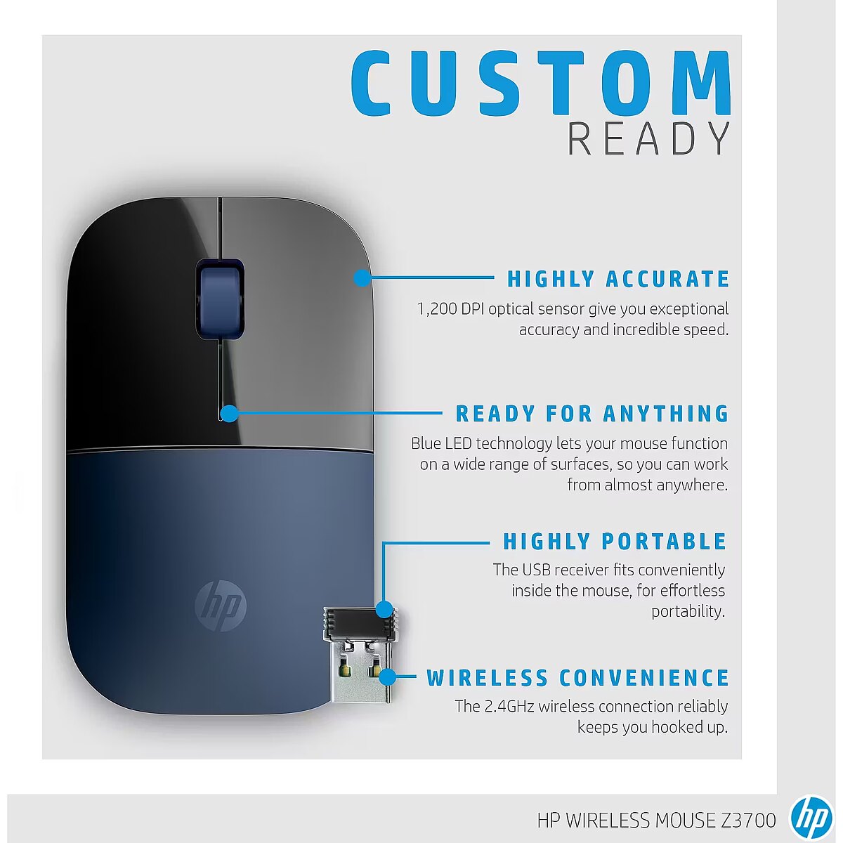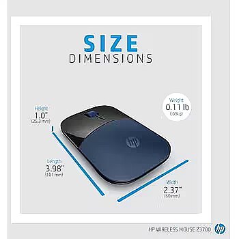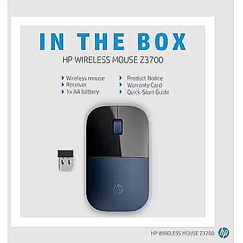 LongSummaryDescription - HP Wireless Mouse Z3700. Form factor: Ambidextrous. Movement detection technology: Blue LED, Device interface: RF Wireless, Movement resolution: 1200 DPI, Buttons type: Pressed buttons, Buttons quantity: 3, Scroll type: Wheel. Power source: Batteries. Product colour: Black, Blue