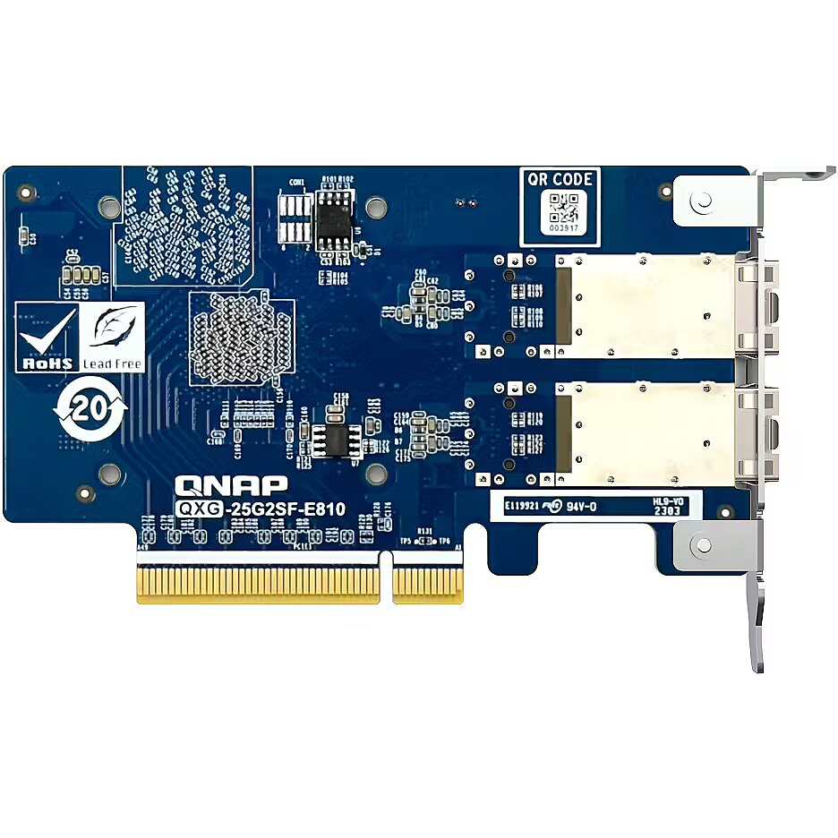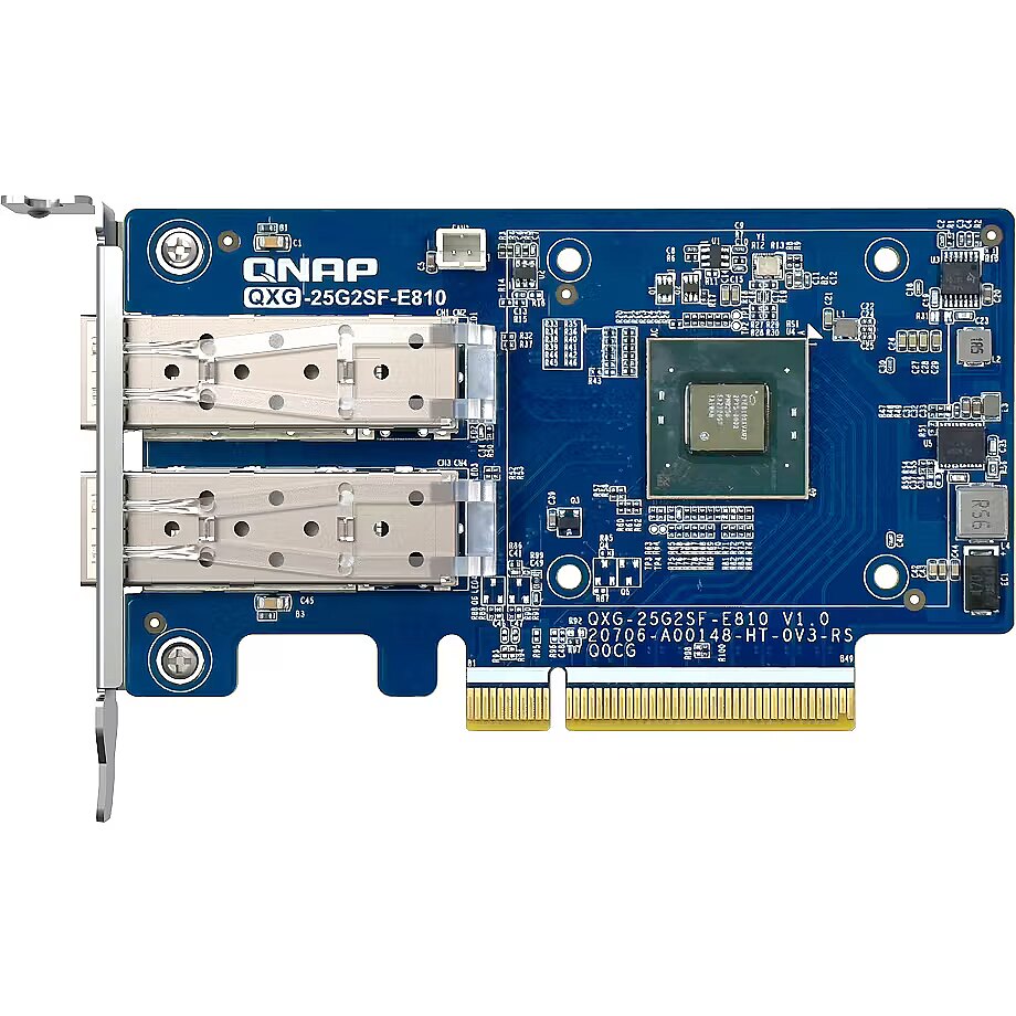 LongDesc - The dual-port QXG-25G2SF-E810 25GbE network expansion card with Intel® Ethernet Controller E810-XXVAM2 supports PCIe Gen4 (backwards compatible with Gen3) and provides up to 25Gbps transfer speeds (10/25Gbps supported). By using SMB Multichannel to aggregate multiplied network connections, you maximize available bandwidth and can achieve up to 50Gb/s for accelerating file sharing and intensive data transfer. With Network Offload support, the QXG-25G2SF-E810 greatly boosts network efficiency and is ideal for I/O-intensive and latency-sensitive virtualization applications, data centers, and multimedia transmission/real-time video editing.Compatible with NAS and PCQNAP Network Expansion Cards support NAS operating systems (QTS and QuTS hero), Windows® 11, Windows Server® and Linux®, allowing you to expand the performance potential of all your networked devices.Build 25GbE networks with QNAP NAS and high-speed network switchesQNAP provides one-stop 25GbE storage and networking solutions for ultra-high speed connectivity to meet various needs. The TS-h2287XU-RP NAS not only fully realizes 25Gb/s performance but also allows for more connected PCs/workstations by installing the QXG-25G2SF-E810 through PCIe Gen 4 slots. Coupled with 25GbE network switch, you can create an ultra-high speed and scalable network environment with great cost efficiency.Ensure reliable data transfer with Forward Error Correction (FEC)The QXG-25G2SF-E810 supports FEC to overcome packet loss – a potentially common occurrence in fast, long-distance networks. FEC helps the receiving side detect and recover lost data to correct bit errors, thus ensuring reliable data transmission over “noisy” communication channels. With three FEC modes, you can use a suitable cable and switch to build an optimal network environment.Enable SMB Multichannel for multiplied network performanceQNAP provides various NAS systems that come with built-in 25GbE ports. You can add more 25GbE connections by installing the QXG-25G2SF-E810 PCIe network cards, and enable SMB Multichannel to enjoy 50Gb/s (or higher) network speeds with connected client devices, giving you a flexible and cost-effective high-speed storage solution.Supports Windows and Linux servers/workstationsBesides QNAP devices, the QXG-25G2SF-E810 supports many platforms (including Windows 11, Windows Server® 2022 and Ubuntu® 20.04 LTS) allowing you to attain optimal business performance for a wider range of system applications and services. The higher bandwidth density with reduction in links helps reduce cabling and operational costs.Faster ServerFaster server connections within data centers accelerate data aggregation and operational performance.Denser ComputeBoost the productivity of compute-demanding tasks such as cloud computing, virtual machines, containers, and more.Bigger DataEmpower the movement of large files from surveillance streams, 4K/8K media, Internet of Things, and more.Scalability25GbE is agile, scalable, and provides an easy upgrade path to 50GbE or 100GbE, ensuring that your IT infrastructure is future-proofed.