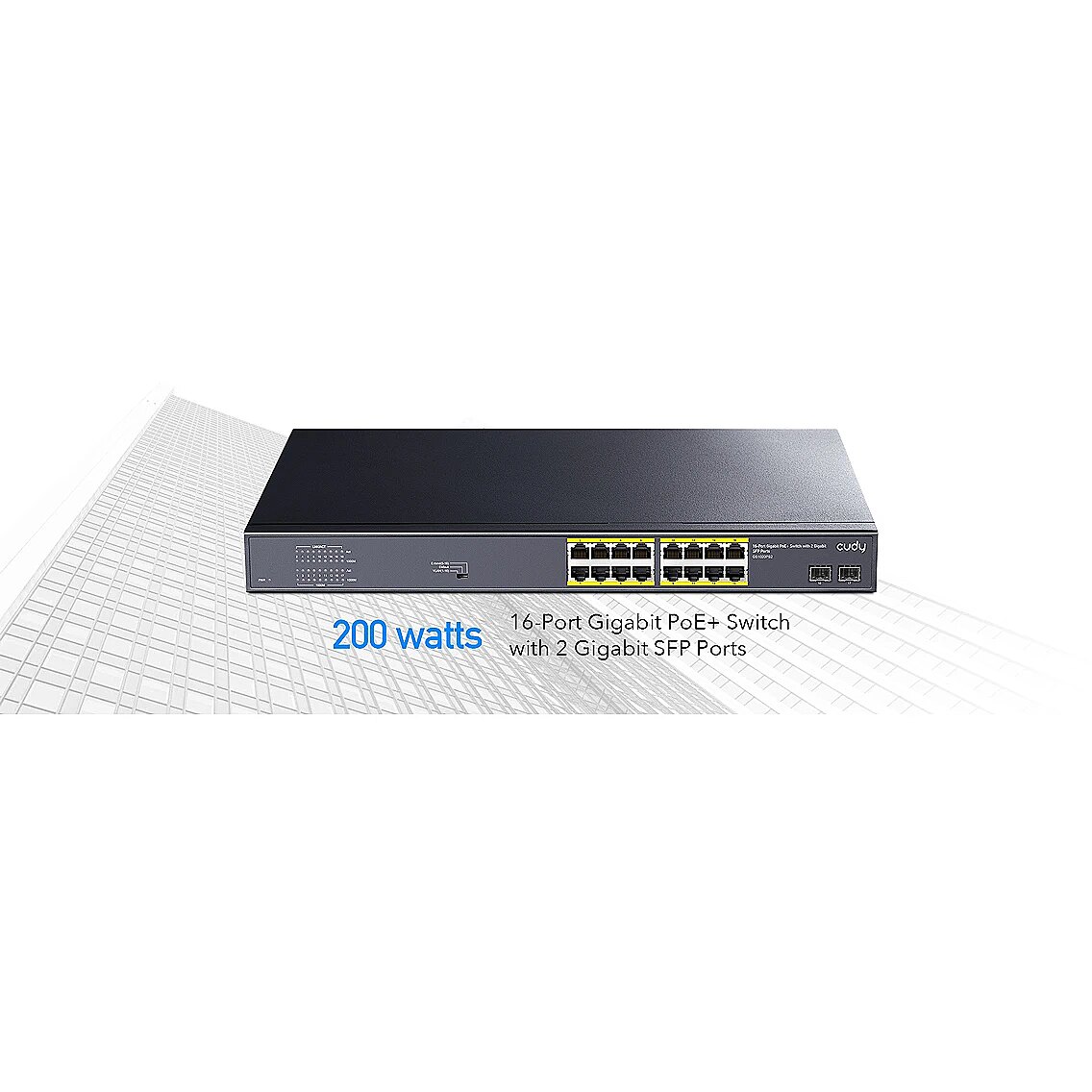 Description - GS1020PS2 16-Port Gigabit PoE+ Switch with 2 Gigabit SFP Ports Complies with IEEE 802.3af / 802.3at PoE standard 200W total PoE power budget, up to 30W per port CCTV mode supports remote power and data transmission distance up to 250M VLAN mode supports 16 isolated POE+ ports LED indicators for network diagnostics 19 inch metal case, internal power supply