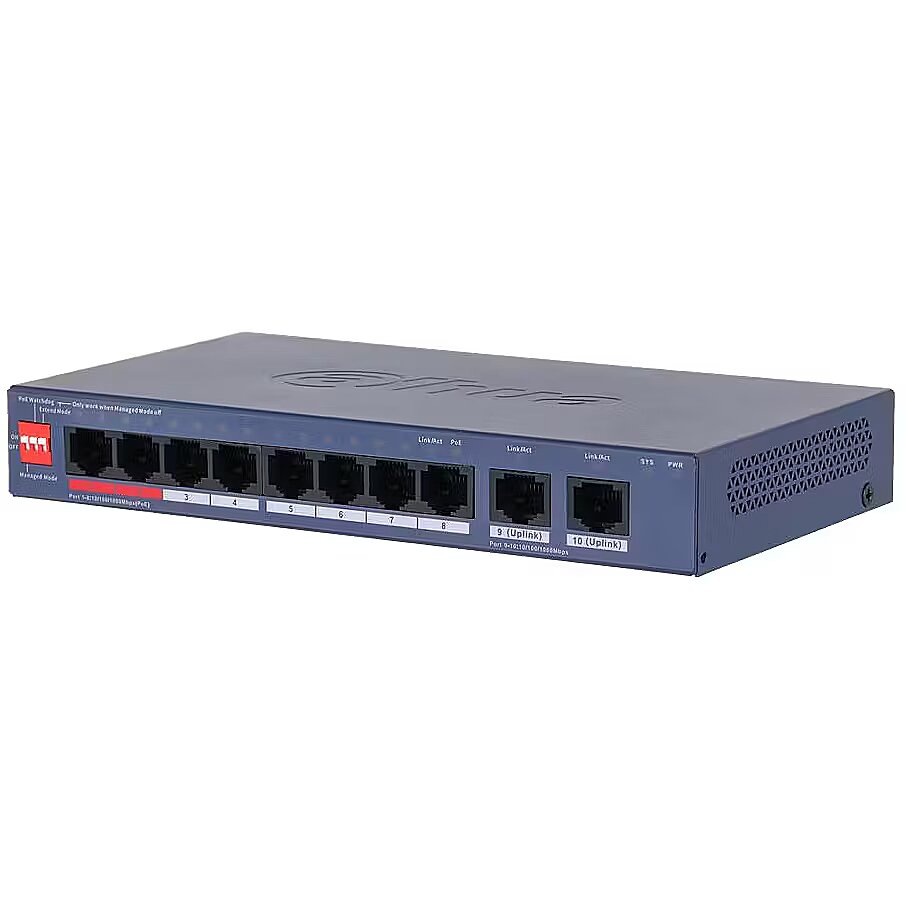Description - 10-Port Cloud Managed Desktop Switch with 8-Port PoE > 8 × RJ-45 10/100 Mbps PoE ports, 2 x RJ-45 Gigabit ports. > 110 W total PoE budget, 802.3af/at on all PoE ports, additional 802.3 bt on red ports. > DIP switch to fast turn on/off working mode of Cloud-Managed, PoE Watchdog, Long Distance PoE. > Wide operating temperature ranging from –10 °C to 55 °C. > Supports VLAN and loop protection. > WEB-managed and centralized cloud management through the DoLynk App and performs real-time monitoring of the network. > Easy config to auto detect and set up network and security systems.