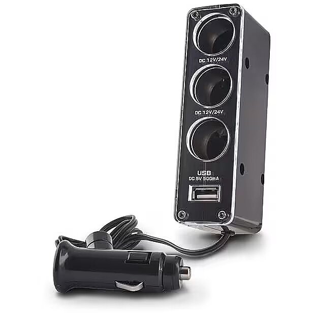 description_ru - Разделитель гнезда автомобильной зарядки. Каждое гнездо поддерживает 12 / 24 вольт. Так же имеется USB гнездо для зарядки любых мобильных устройств. Кабель 60 см.